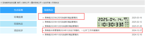 该栏目未按照更新频率进行更新维护,未及时更新息烽县2025年3月污染源环境监管情况及息烽县水务管理局2025年1、2、3月份“双随机、一公开”工作开展情况,建议市生态环境局息烽分局、息烽县水务局及时收集相关信息对该栏目进行更新维护。