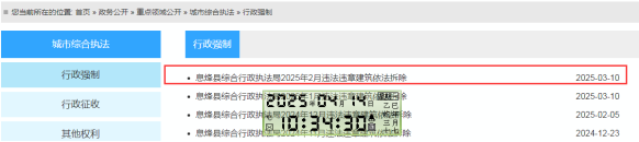 该栏目超过1个月未及时更新维护,未及时更新息烽县综合行政执法局2025年3月违法违章建筑依法拆除情况,建议县综合行政执法局及时收集相信息对该栏目进行更新维护。