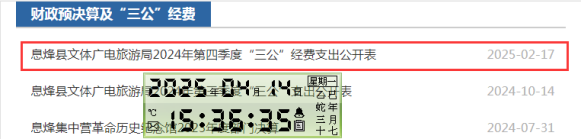 该栏目未及时更新息烽县文体广电旅游局2025年第一季度“三公”支出公开表,建议县文体广电旅游局及时收集相关信息对栏目进行更新维护。