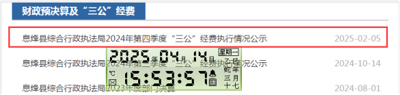 该栏目未及时更新息烽县综合行政执法局2025年第一季度“三公”经费执行情况公示,建议县综合行政执法局及时收集相关信息对栏目进行更新维护。