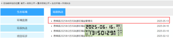 该栏目超过1个月未及时更新维护,未及时更新息烽县2025年5月污染源环境监管情况,建议市生态环境局息烽分局及时收集相信息对该栏目进行更新维护。
