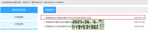 该栏目超过1个月未及时对栏目进行更新维护,未及时更新息烽县综合行政执法局2025年5月行政处罚统计台账,建议县综合行政执法局及时收集相信息对该栏目进行更新维护。