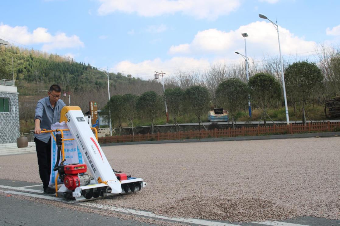 吊瓜园区工作人员操作自动化机器晾晒吊瓜子