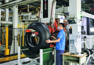 2022年10月14日,在位于修文县扎佐工业园的贵州轮胎载重子午胎分公司内,工人在生产线上忙碌。 贵阳日报融媒体记者 石照昌 摄