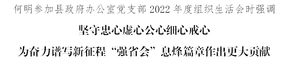 3月29日,县委副书记、县长何明以普通党员身份参加县政府办公室党支部2022年度组织生活会暨民主评议党员,与支部党员学习交流。他强调,要坚守忠心、虚心、公心、细心、戒心,为奋力谱写新征程“强省会”息烽篇章作出更大贡献。