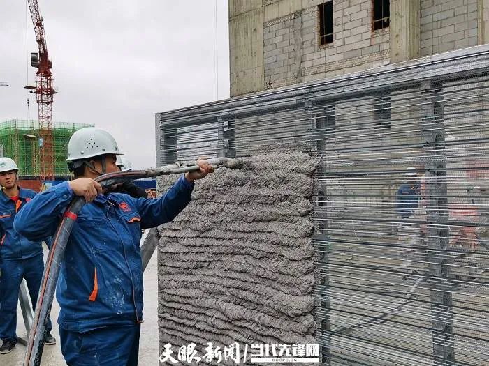 施工人员正在演示磷石膏砂浆喷筑过程。