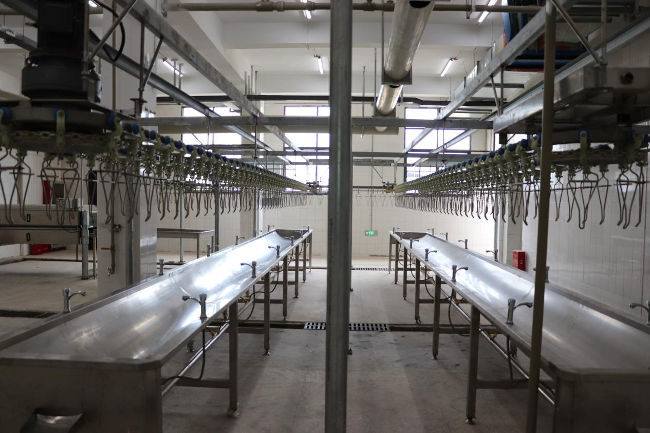 在永阳街道立碑村,息烽德康屠宰厂已建成,目前正在进行屠宰管理系统备案中,待备案完成后进入试生产。记者现场了解到,屠宰厂改建安装了现代化生产流水线,活鸡经挂鸡、沥血、打毛、转挂、分拣等工序,约一小时后即可打包运输。该生产线每小时可处理2000只活鸡,大幅提升生产效率。