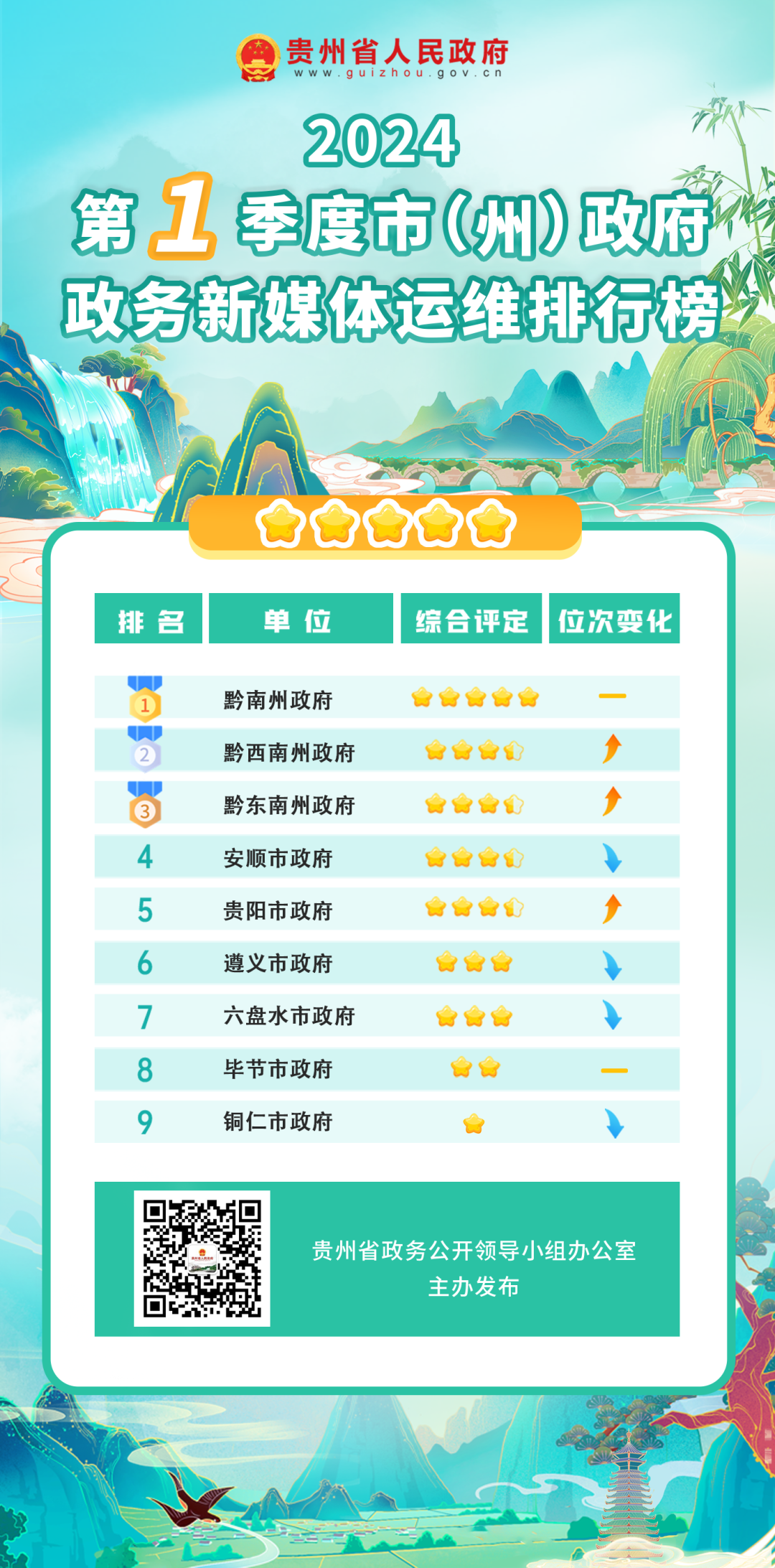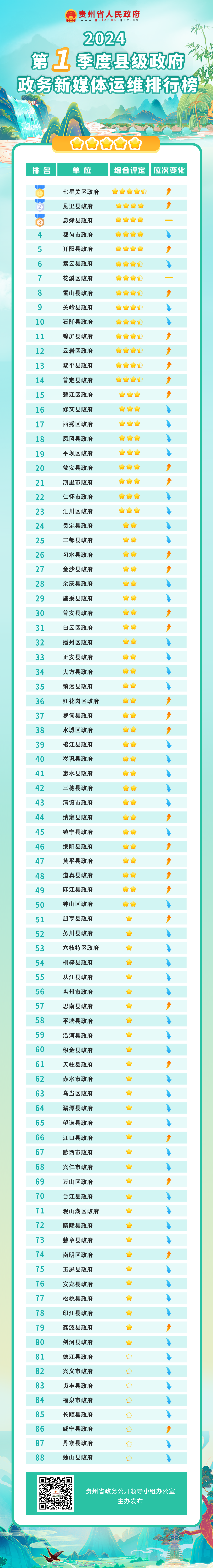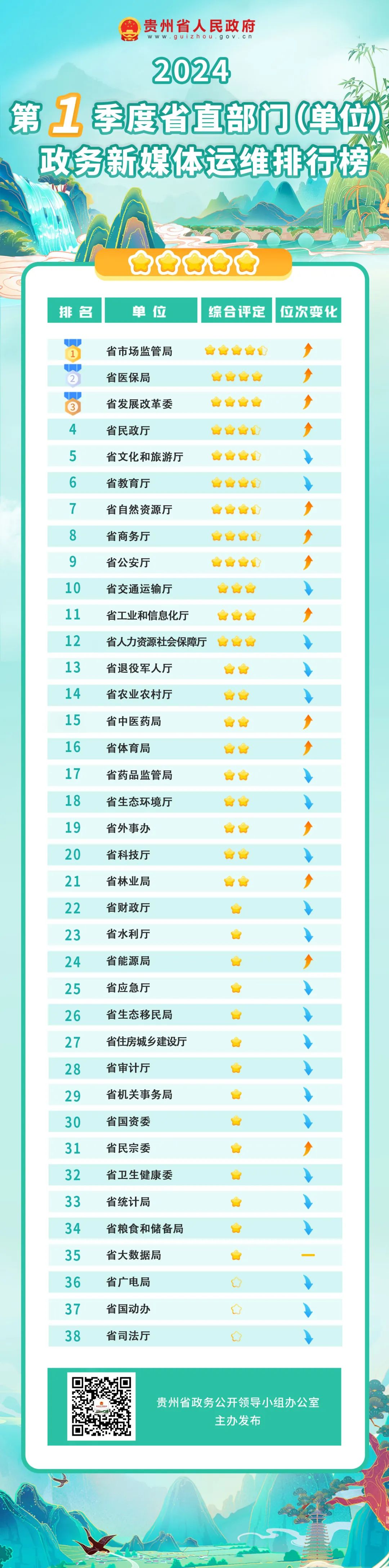 2024年第一季度,省市场监管局、黔南州政府、七星关区政府分别获得省直部门(单位)、市(州)政府、县级政府排行榜第一名;省医保局、黔西南州政府、龙里县政府分别获得第二名;省发展改革委、黔东南州政府、息烽县政府分别获得第三名。
