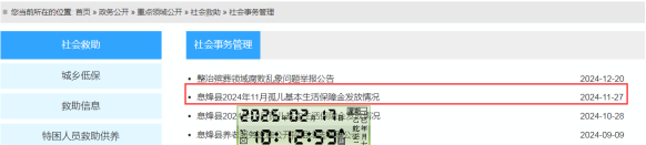 该栏目未按照更新频率进行更新维护,将近2个月未及时对栏目进行更新,未及时更新息烽县2024年12月、2025年1月孤儿基本生活保障金发放情况,建议县民政局及时收集相关信息对该栏目进行更新维护。