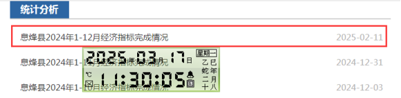 该栏目未及时更新息烽县2025年1、2、3月经济指标完成情况。建议县统计局按月收集规模以上经济指标完成情况对栏目进行更新维护。