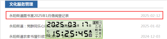 该栏目超过1个月未及时更新信息,未及时更新永阳街道图书室2025年2月借阅登记表,建议永阳街道及时收集相关信息对该栏目进行更新维护。