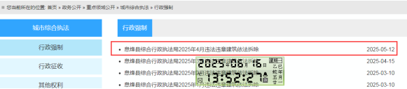 该栏目超过1个月未及时更新维护,未及时更新息烽县综合行政执法局2025年5月违法违章建筑依法拆除,建议县综合行政执法局及时收集相信息对该栏目进行更新维护。