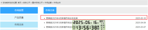 该栏目超过1个月未及时对栏目进行更新维护,未及时更新息烽县2025年5月新增市场主体名单,建议县市场监管局及时收集相关信息对该栏目进行更新维护。