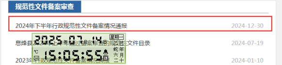 该栏目未及时更新2025年上半年行政规范性文件备案情况通报。建议县司法局及时整理息烽县行政规范性文件备案情况对栏目进行更新维护。