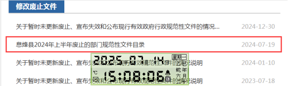 该栏目未及时更新息烽县2025年上半年废止的部门规范性文件目录。建议县司法局及时整理息烽县2025年上半年废止的部门规范性文件目录对栏目进行更新维护。