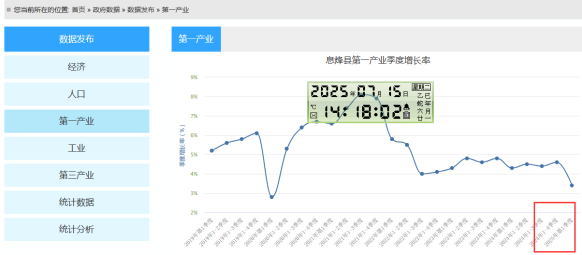 该栏目未及时更新息烽县2025年第1—2季度第一产业季度增长率,建议县统计局及时收集相关信息对栏目进行更新维护。