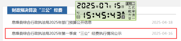 该栏目未及时更新息烽县综合行政执法局2025年第二季度“三公”经费执行情况公示,建议县综合行政执法局及时收集相关信息对该栏目进行更新维护。