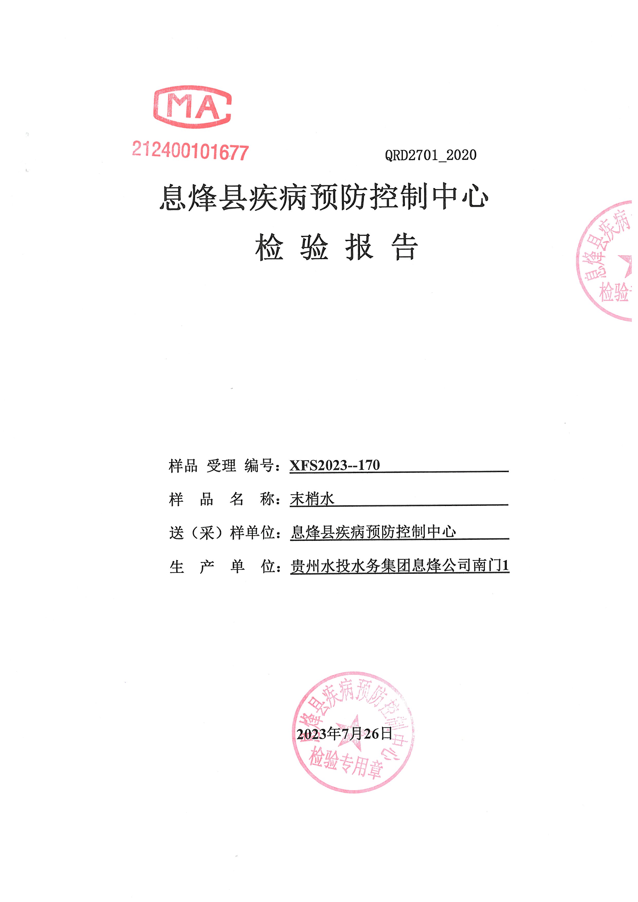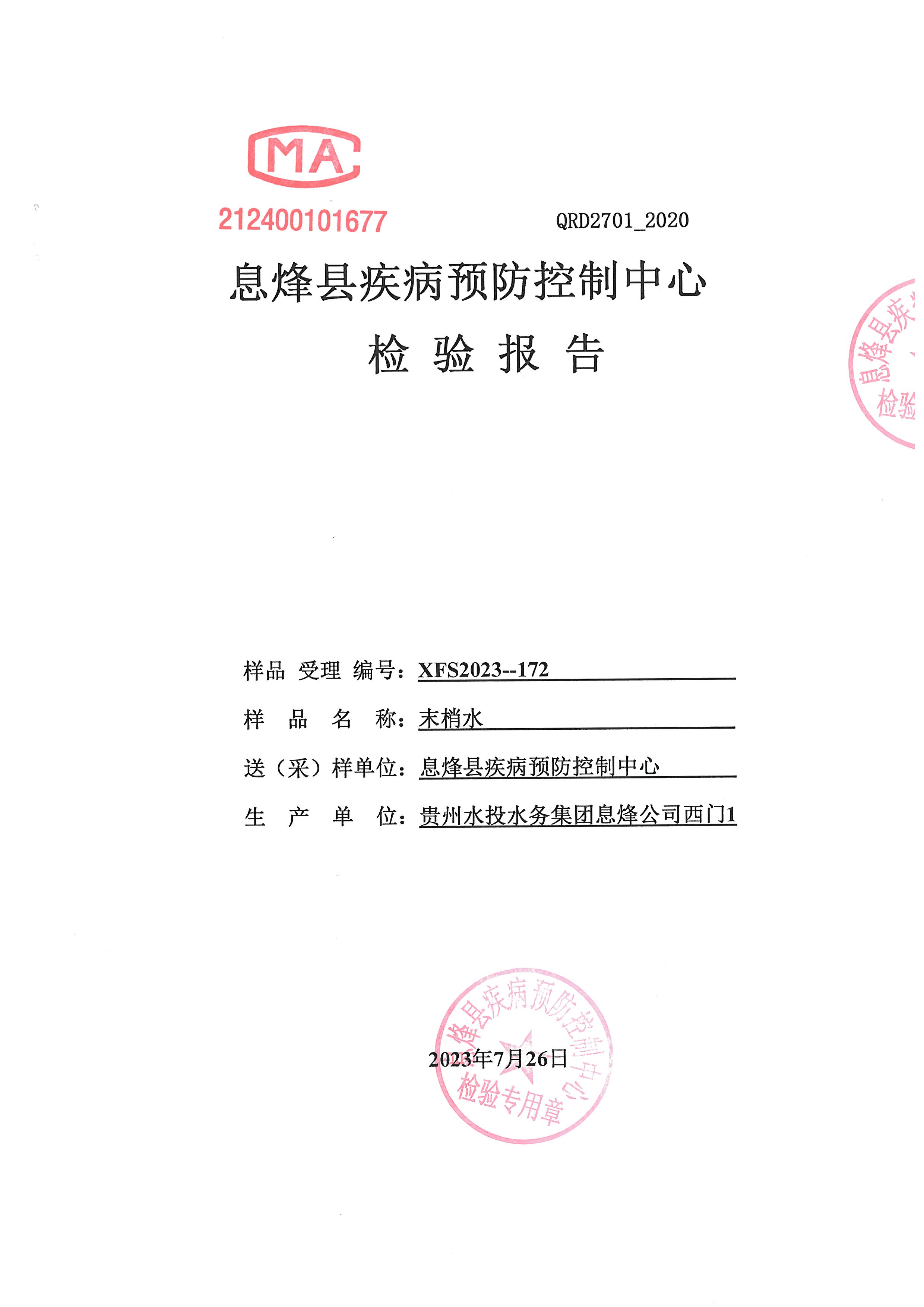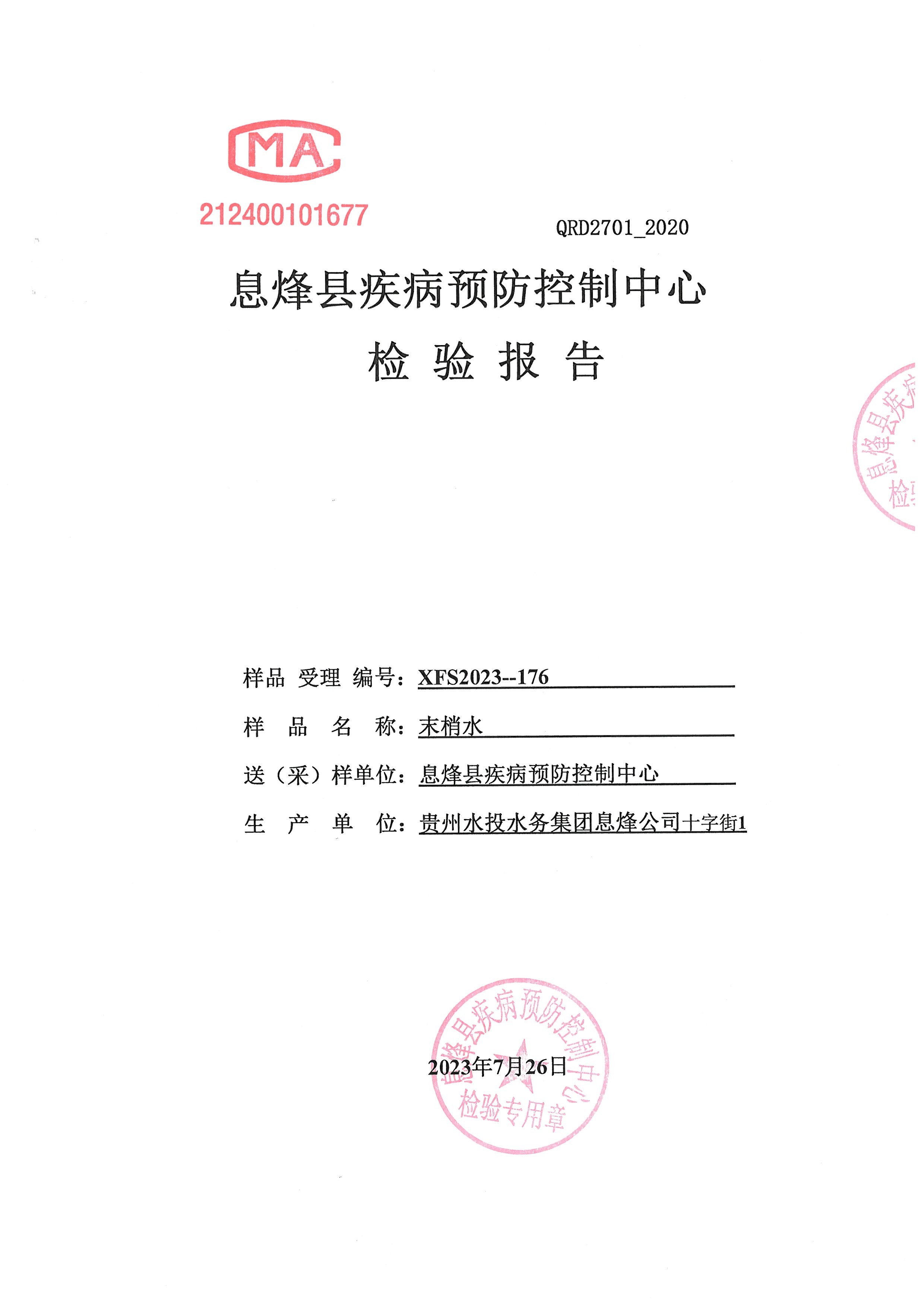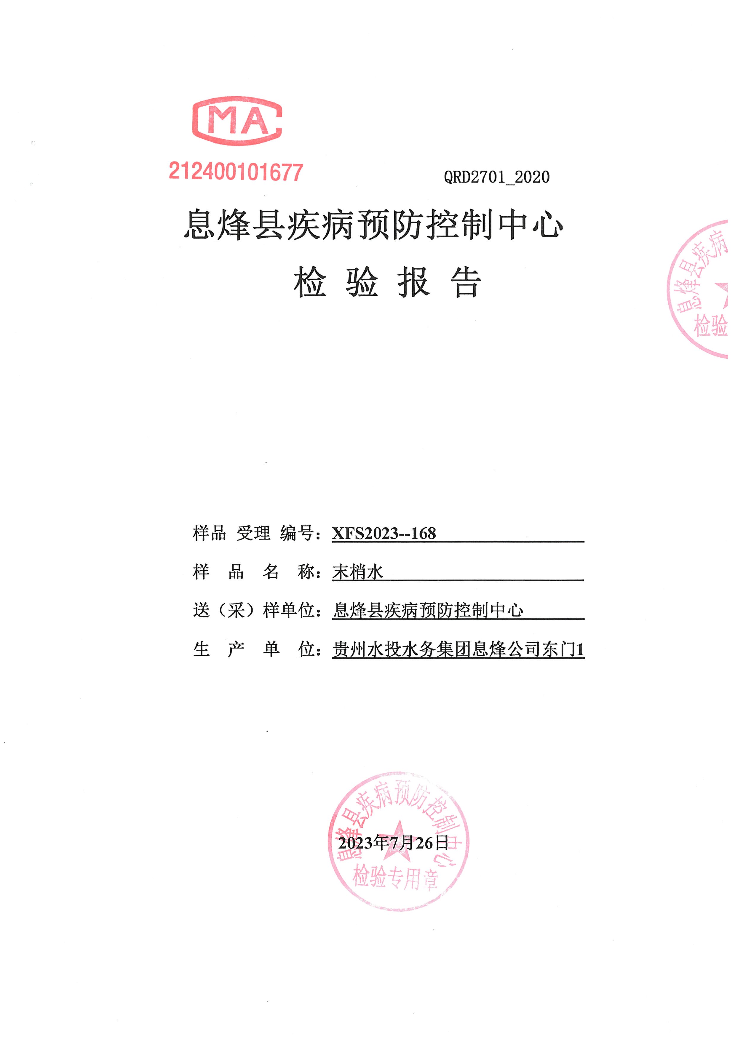 • 信息名称: 贵州水投水务集团息烽有限公司2023年7月份水质检验报告(息烽县疾病预防控制中心检验)