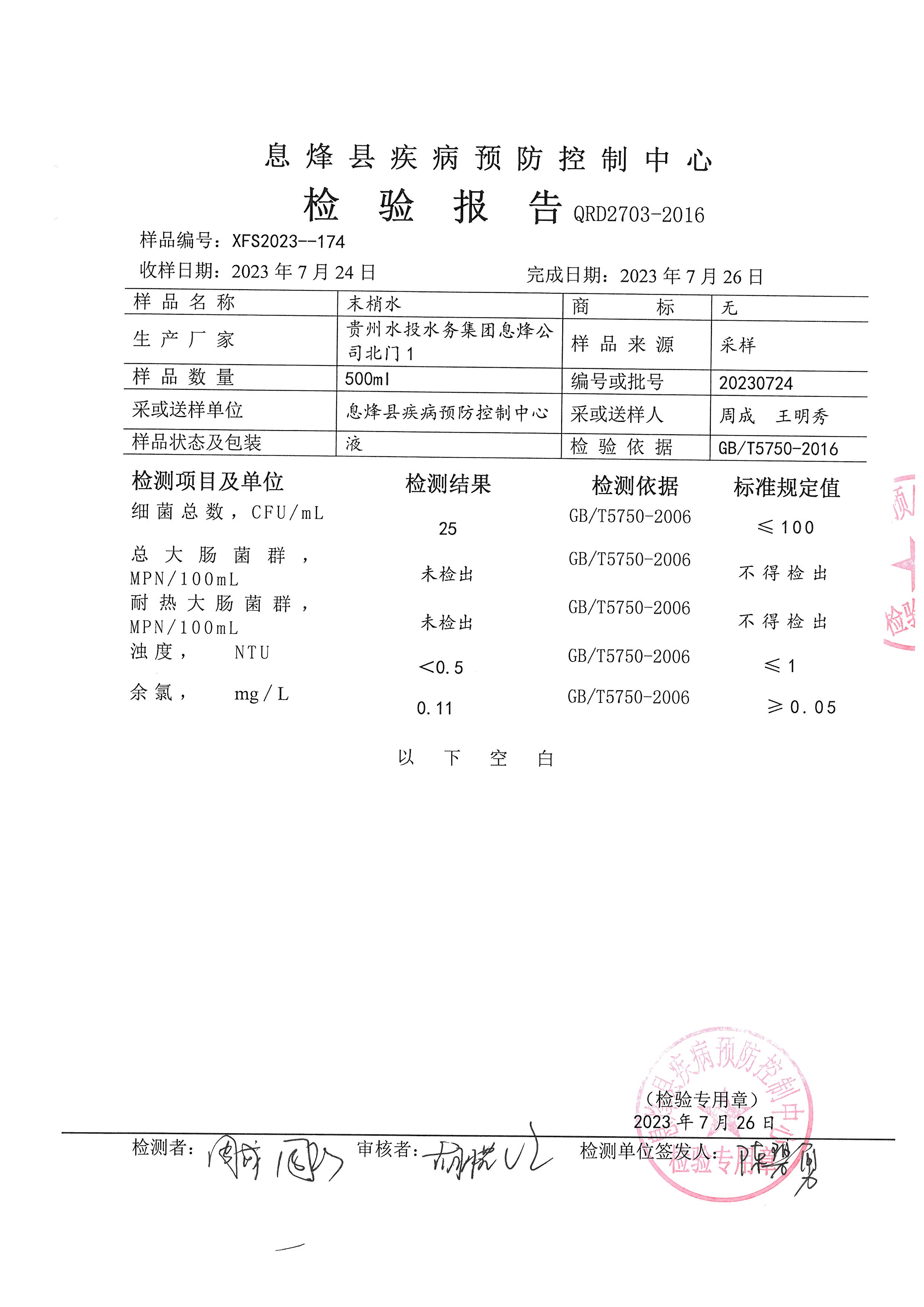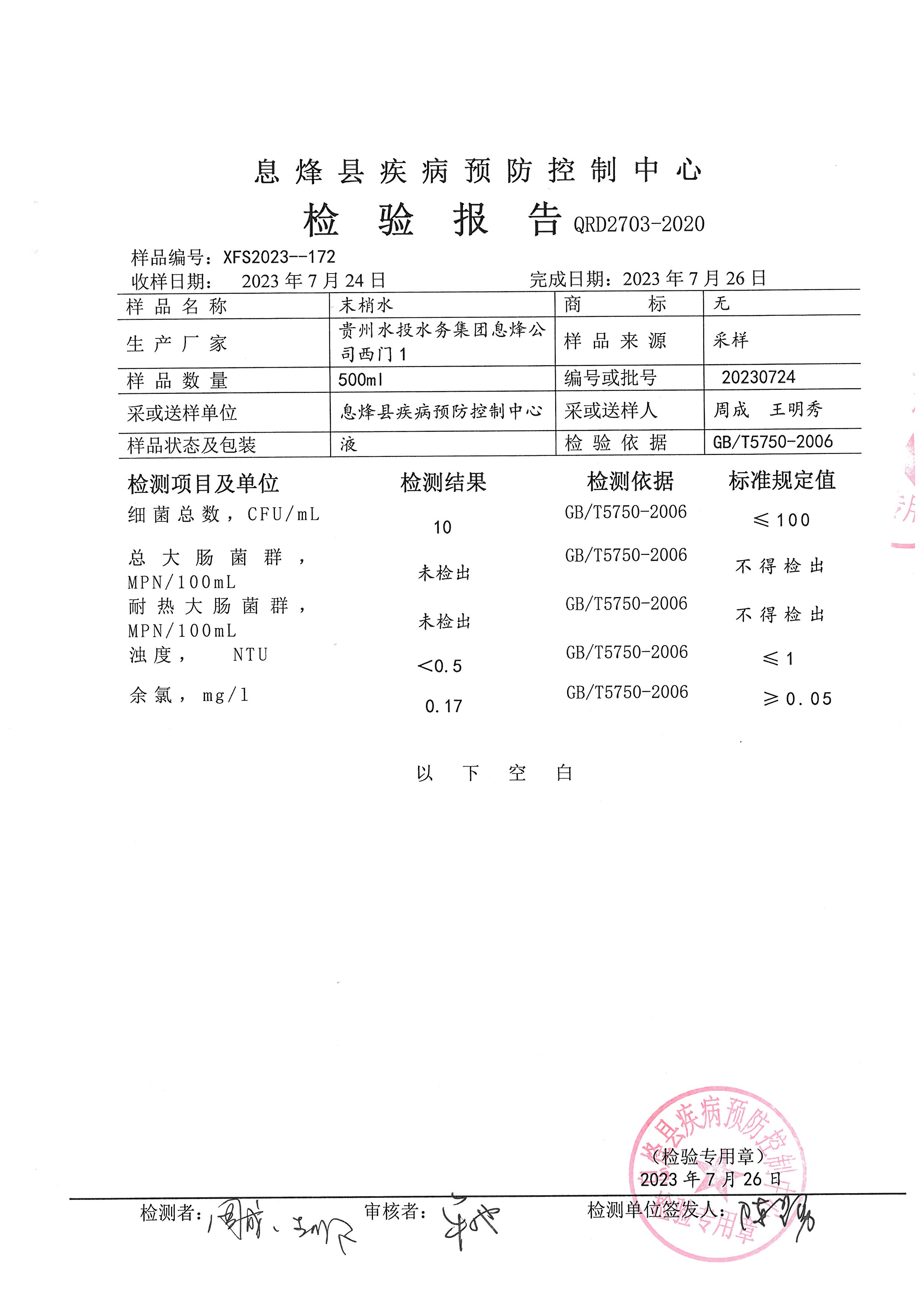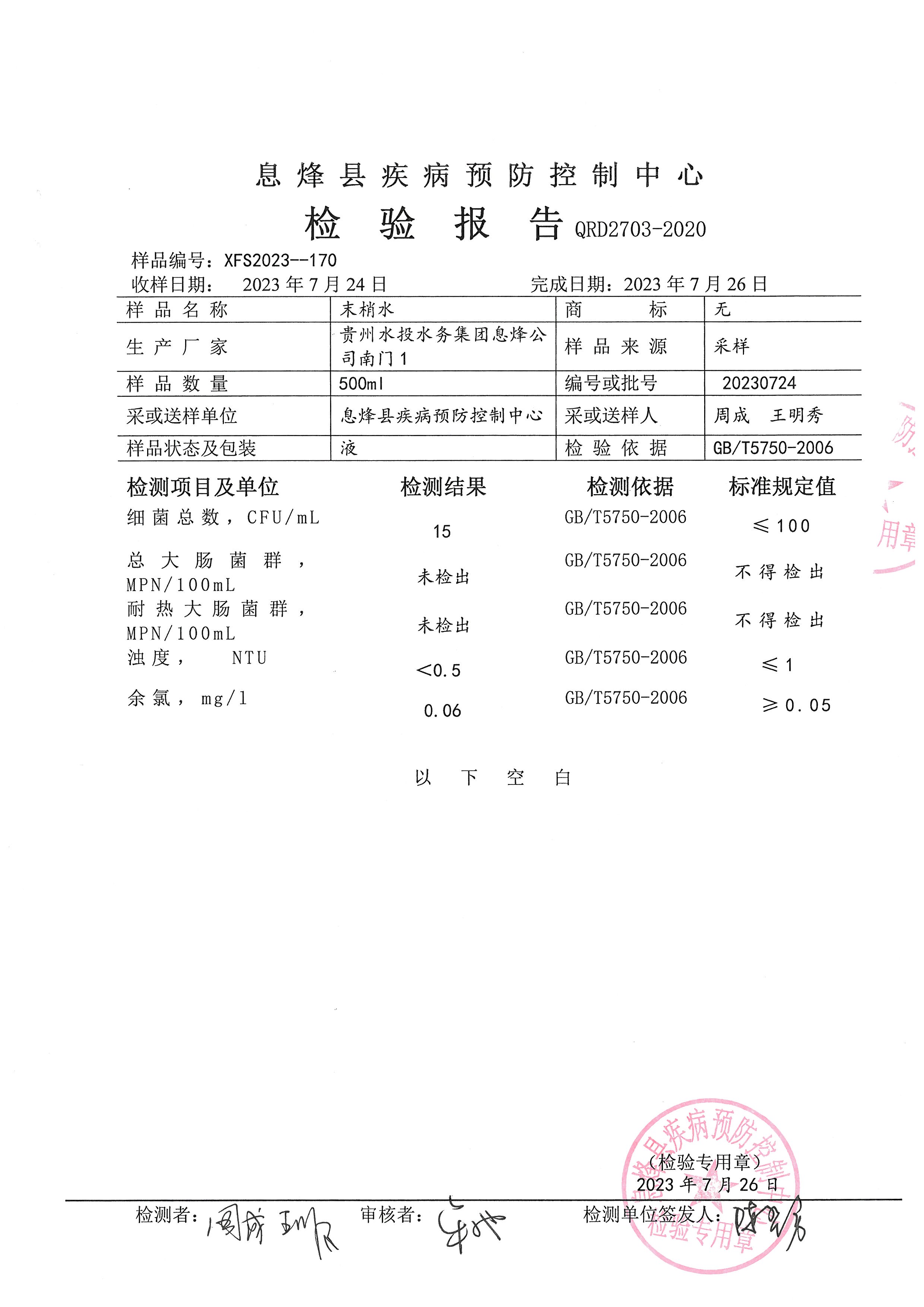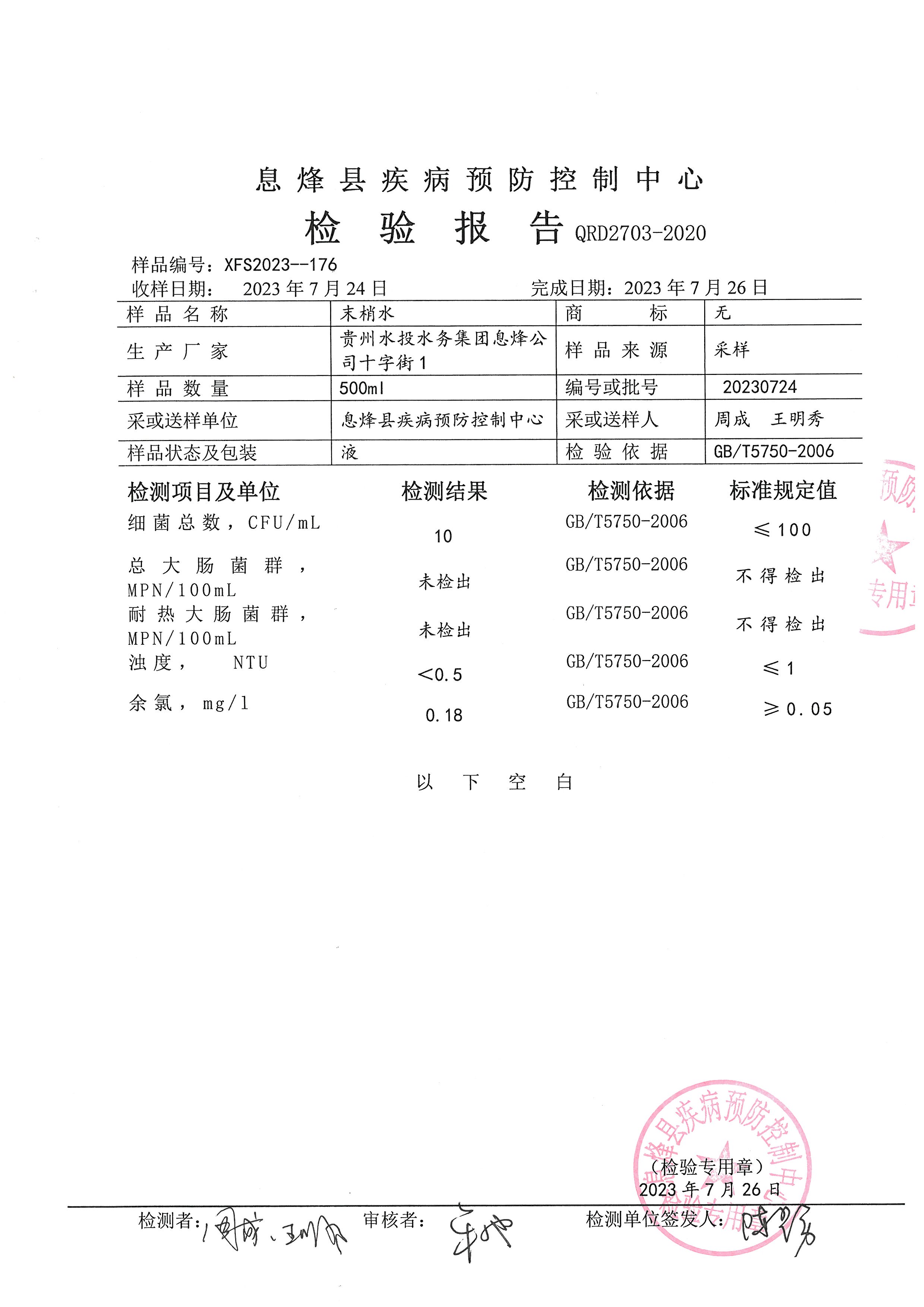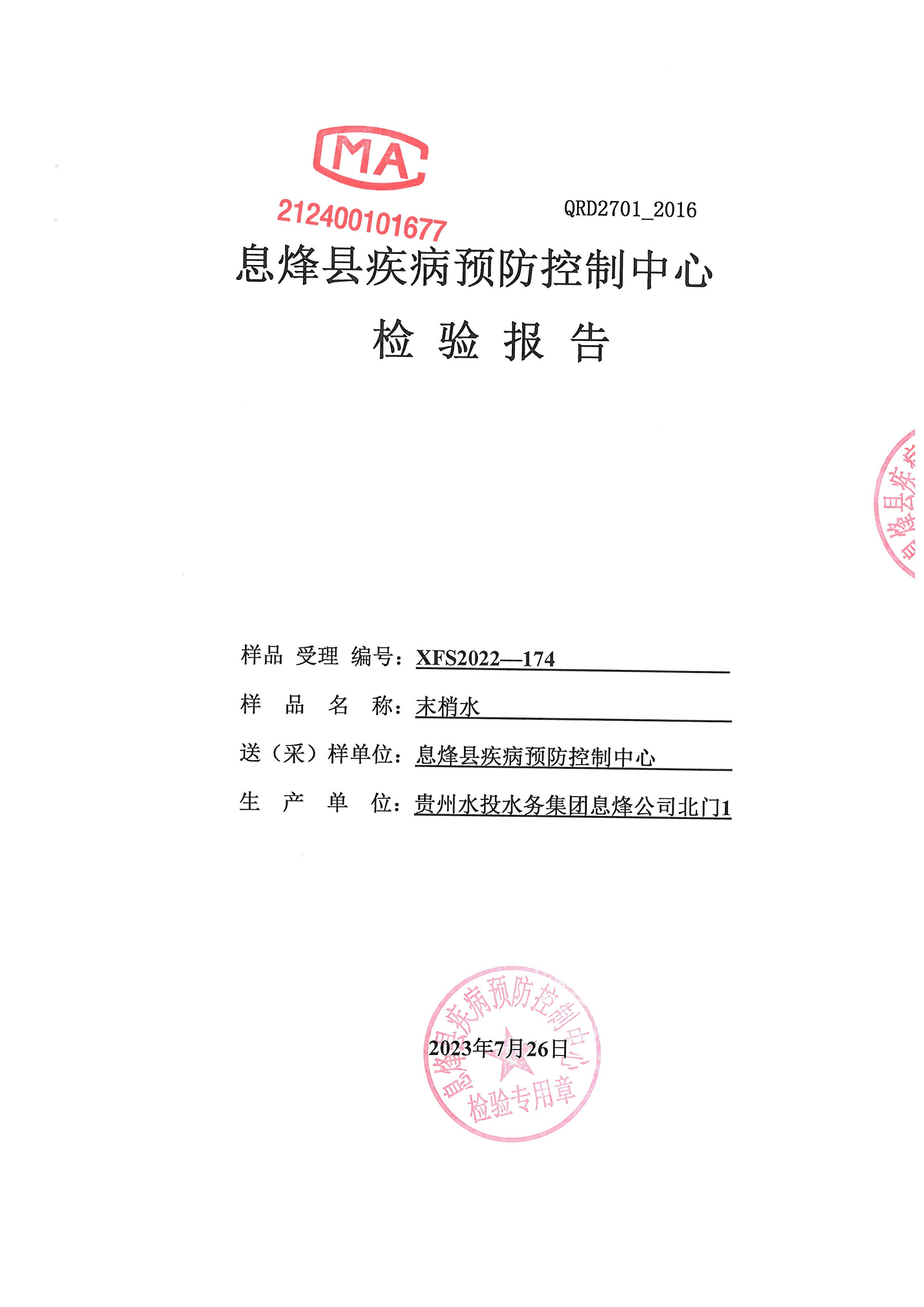• 信息名称: 贵州水投水务集团息烽有限公司2023年7月份水质检验报告(息烽县疾病预防控制中心检验)