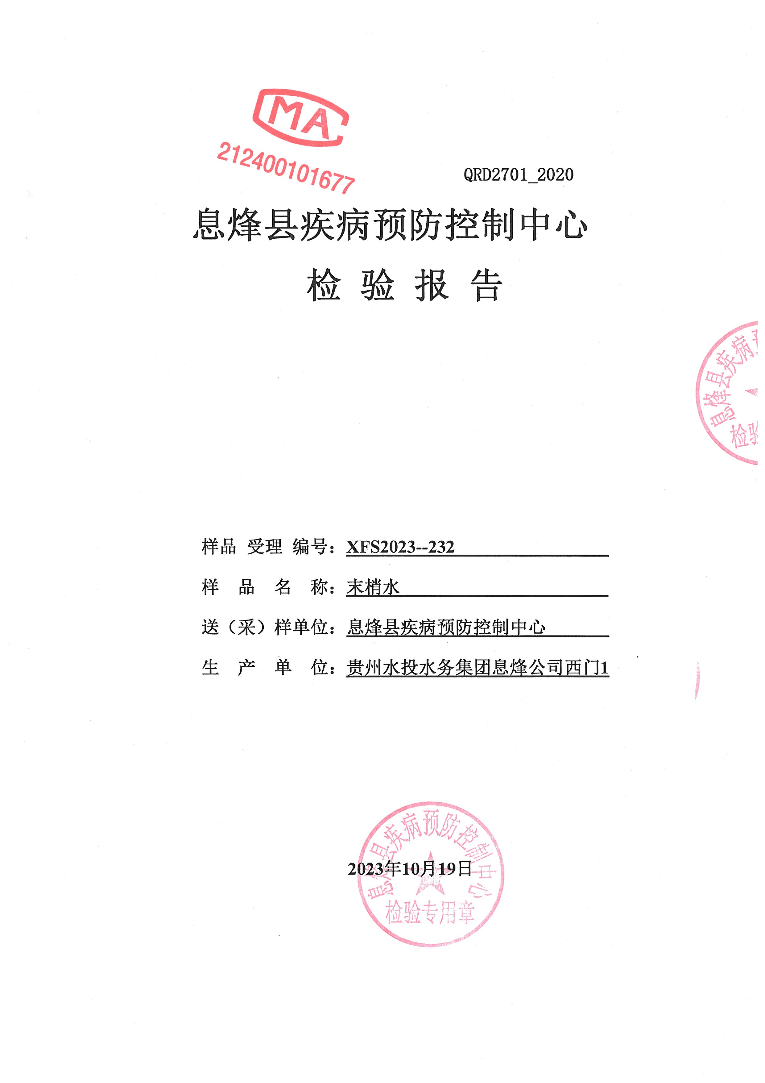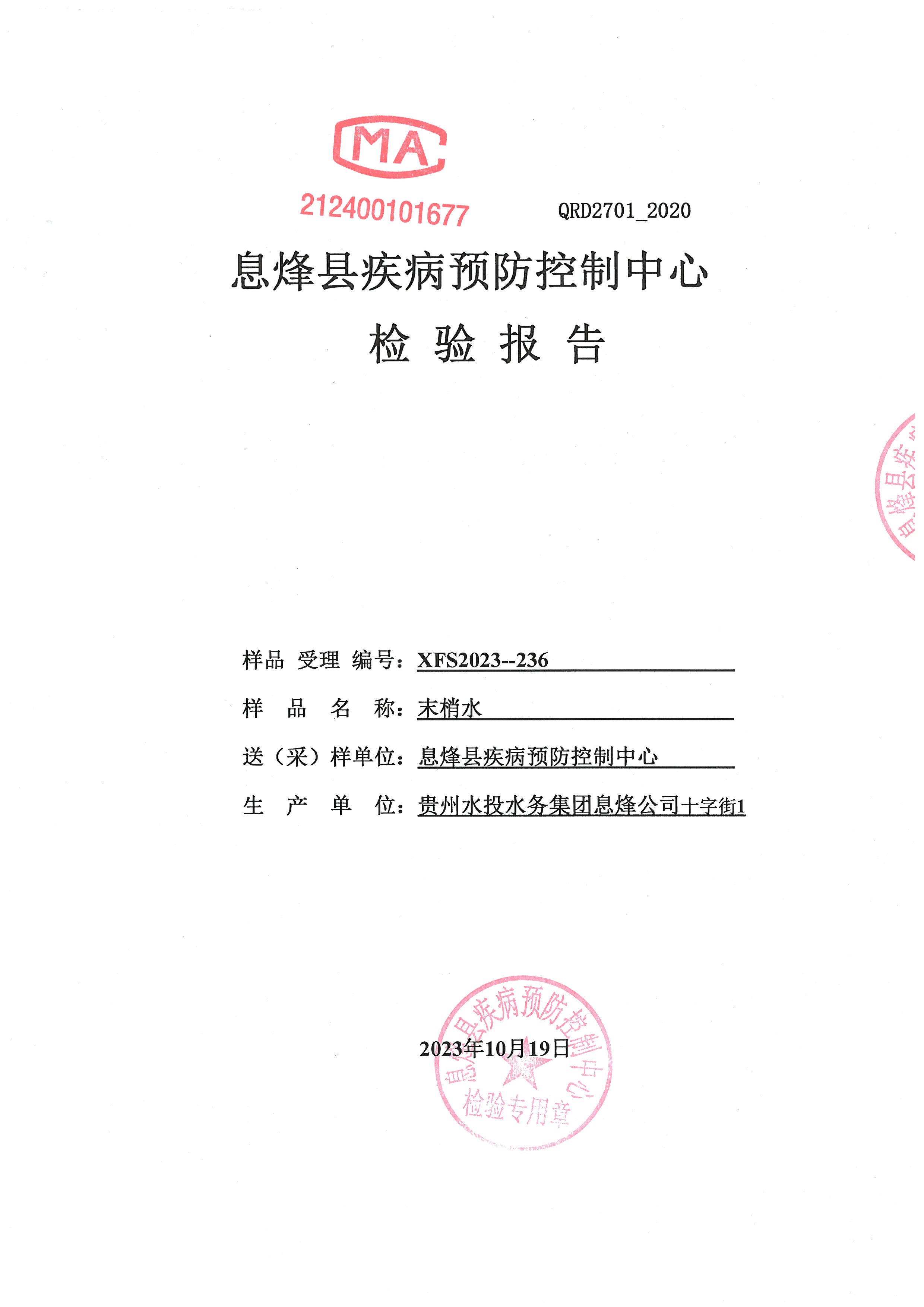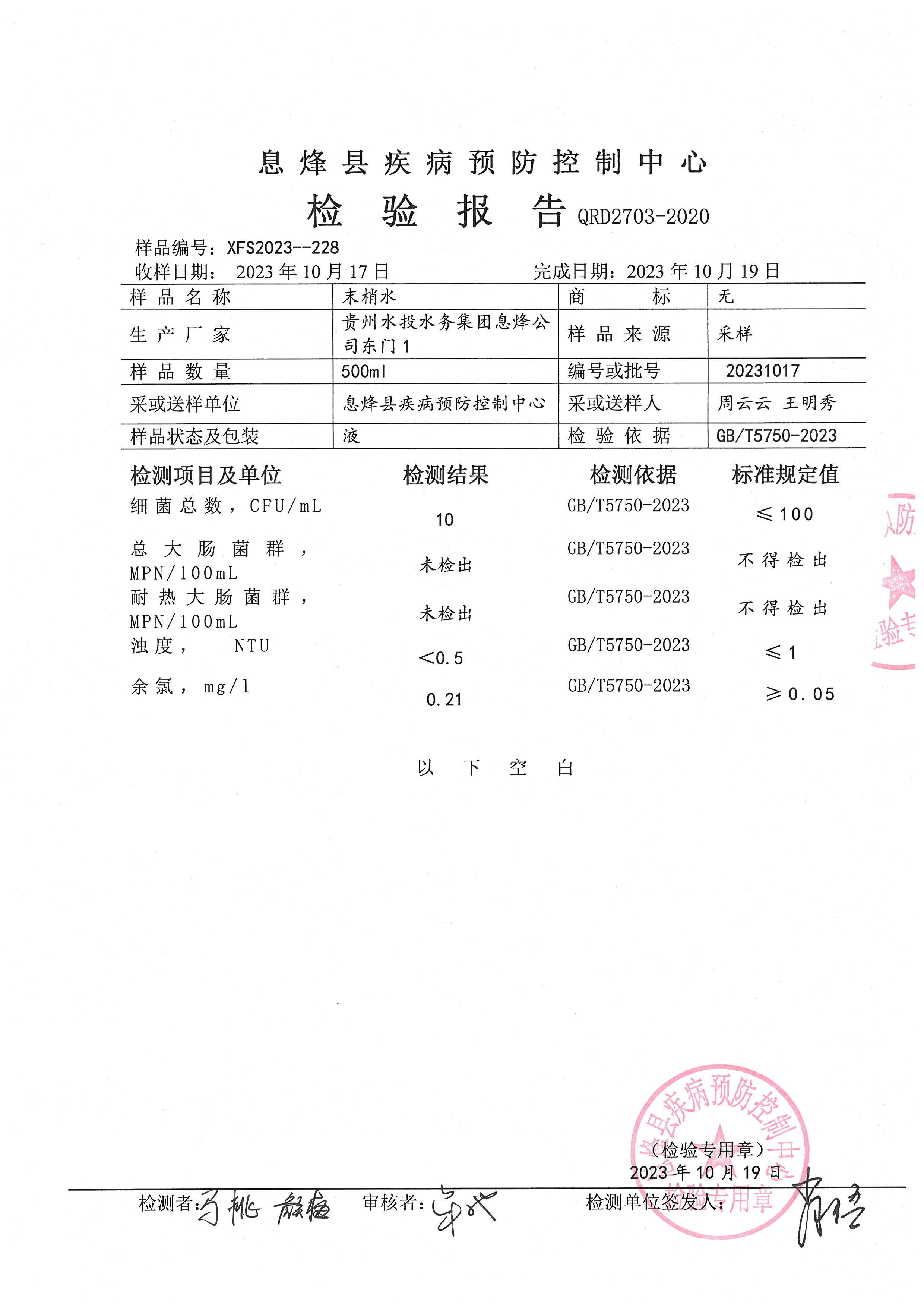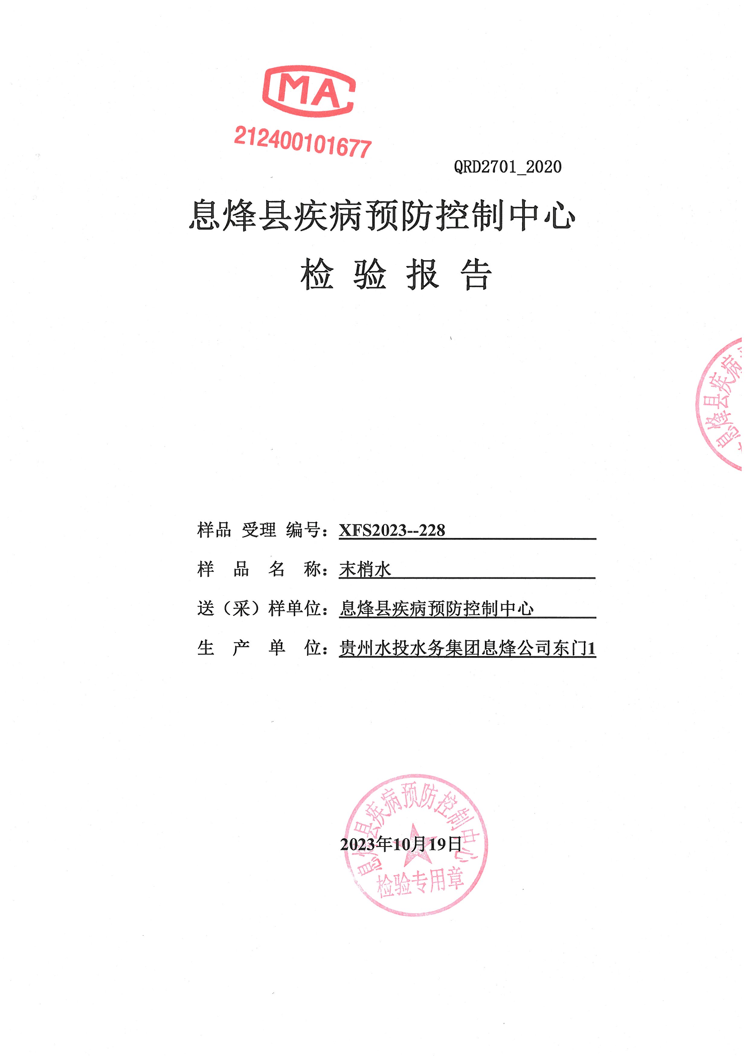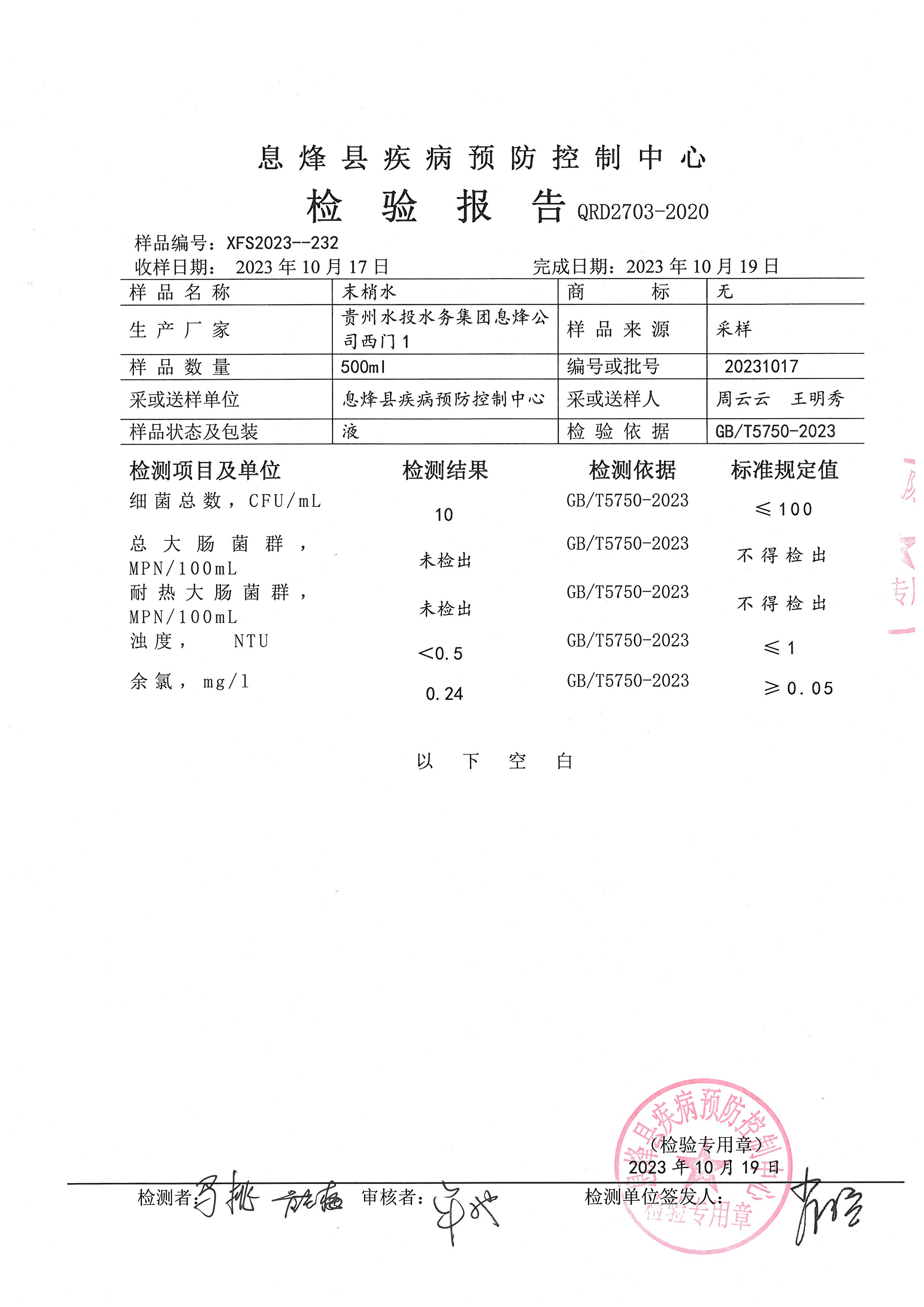 • 信息名称: 贵州水投水务集团息烽有限公司2023年10月份水质检验报告(息烽县疾病预防控制中心检验)