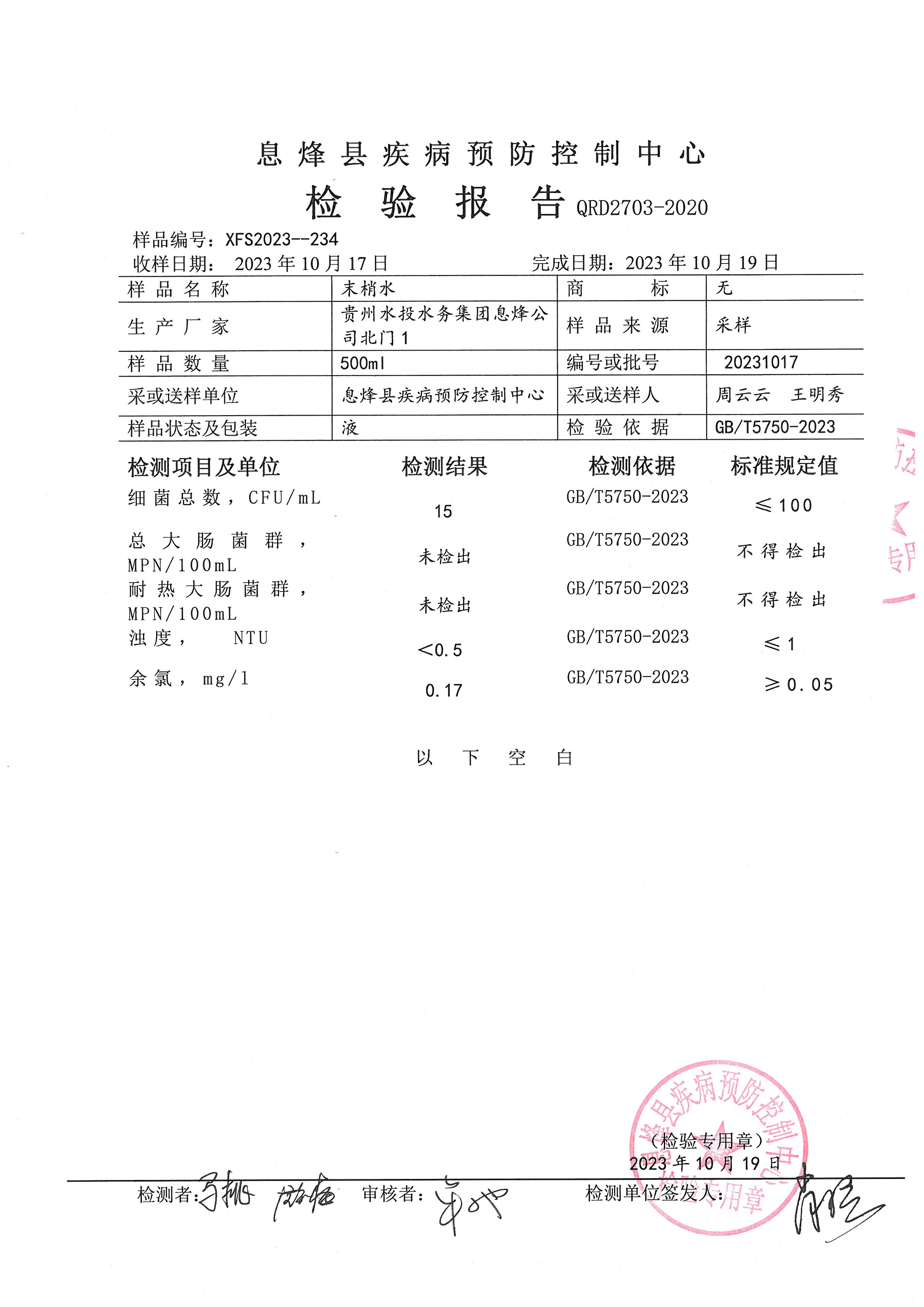 贵州水投水务集团息烽有限公司2023年10月份水质检验报告(息烽县疾病预防控制中心检验)