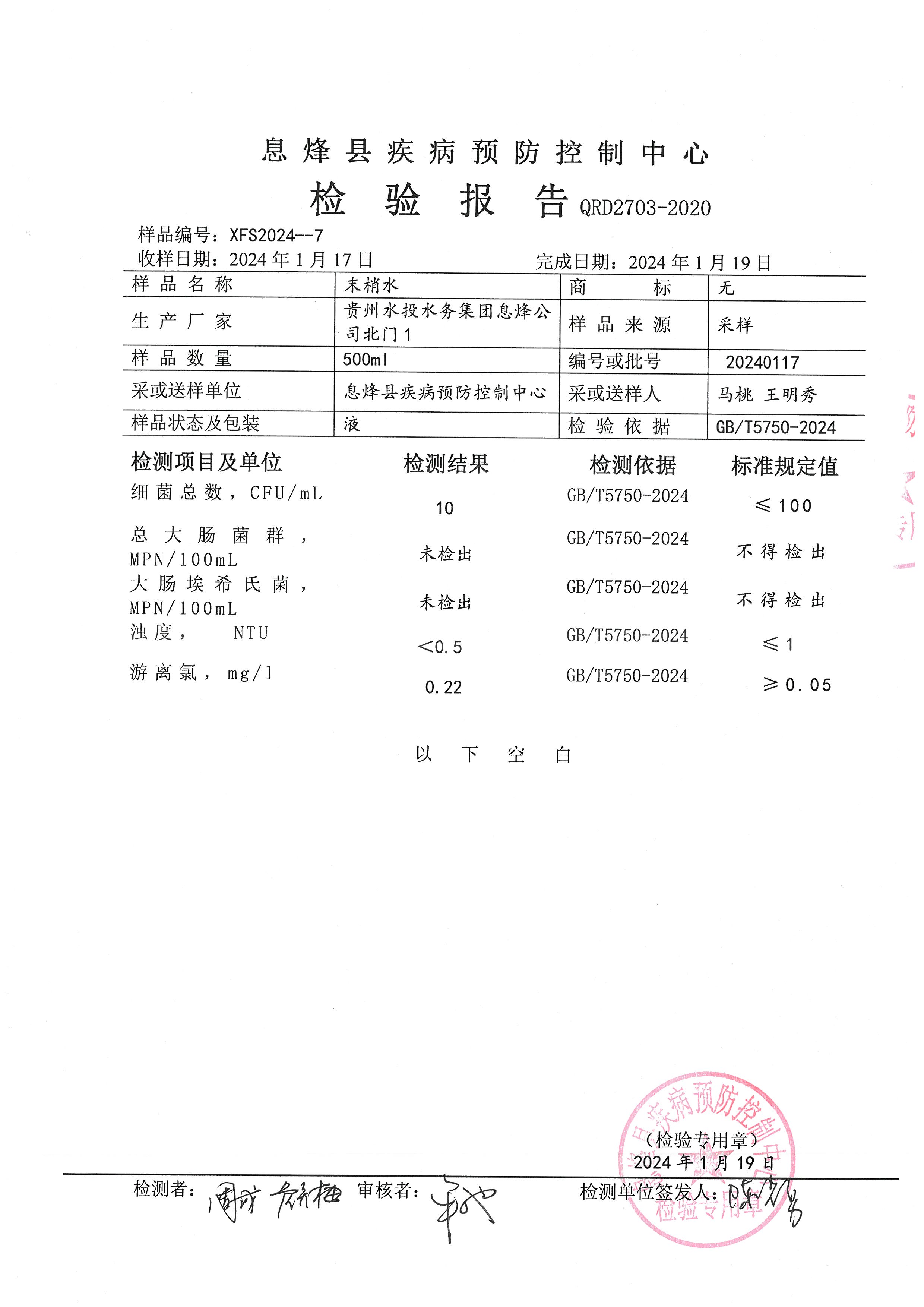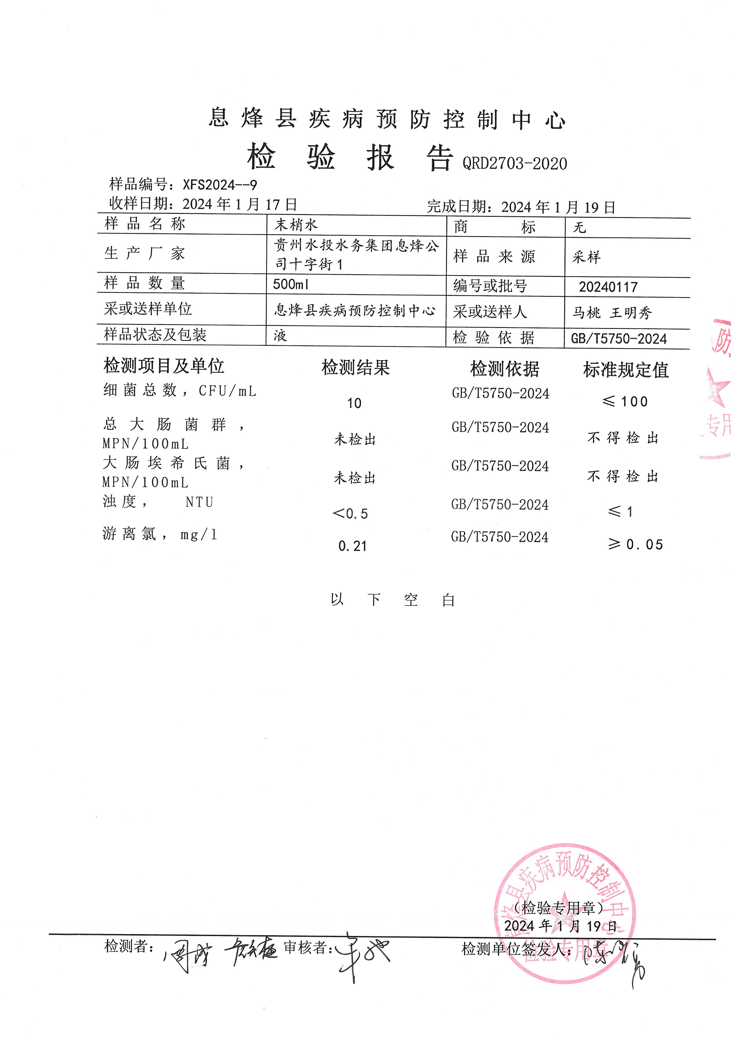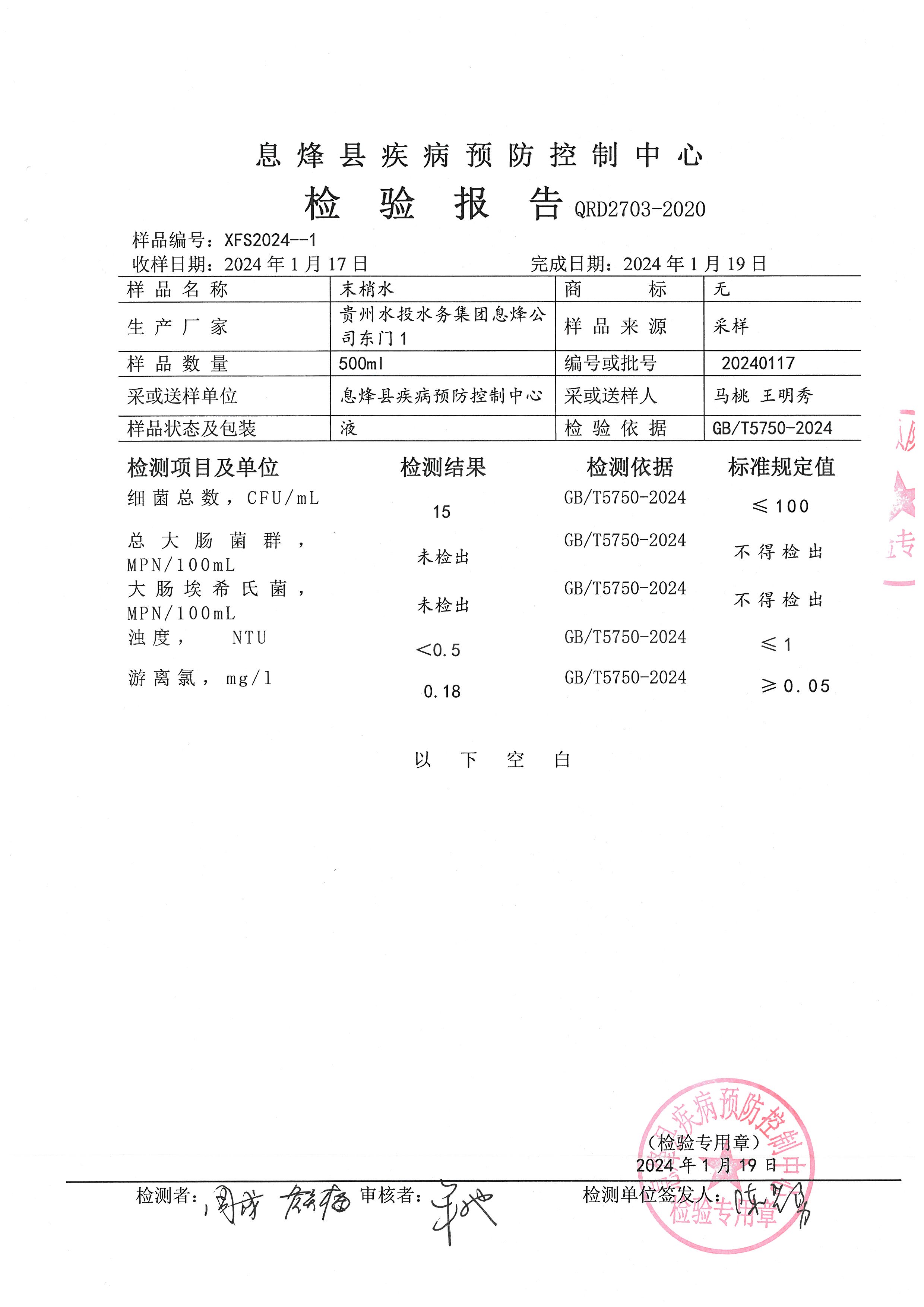 贵州水投水务集团息烽有限公司2024年1月水质检测报告
