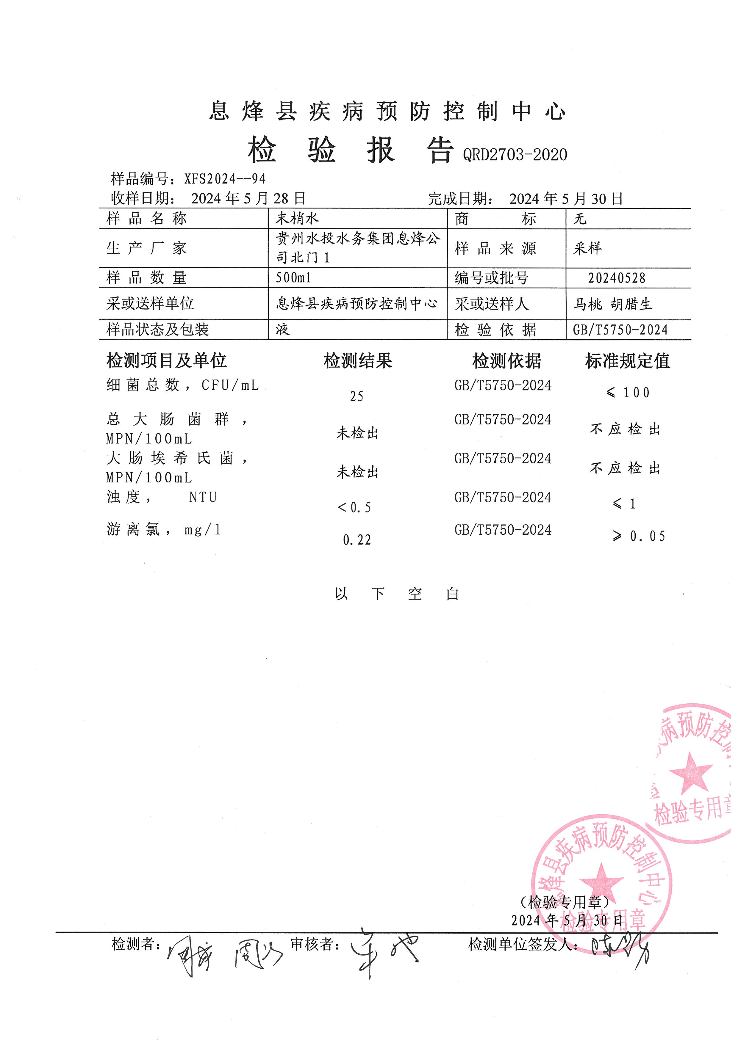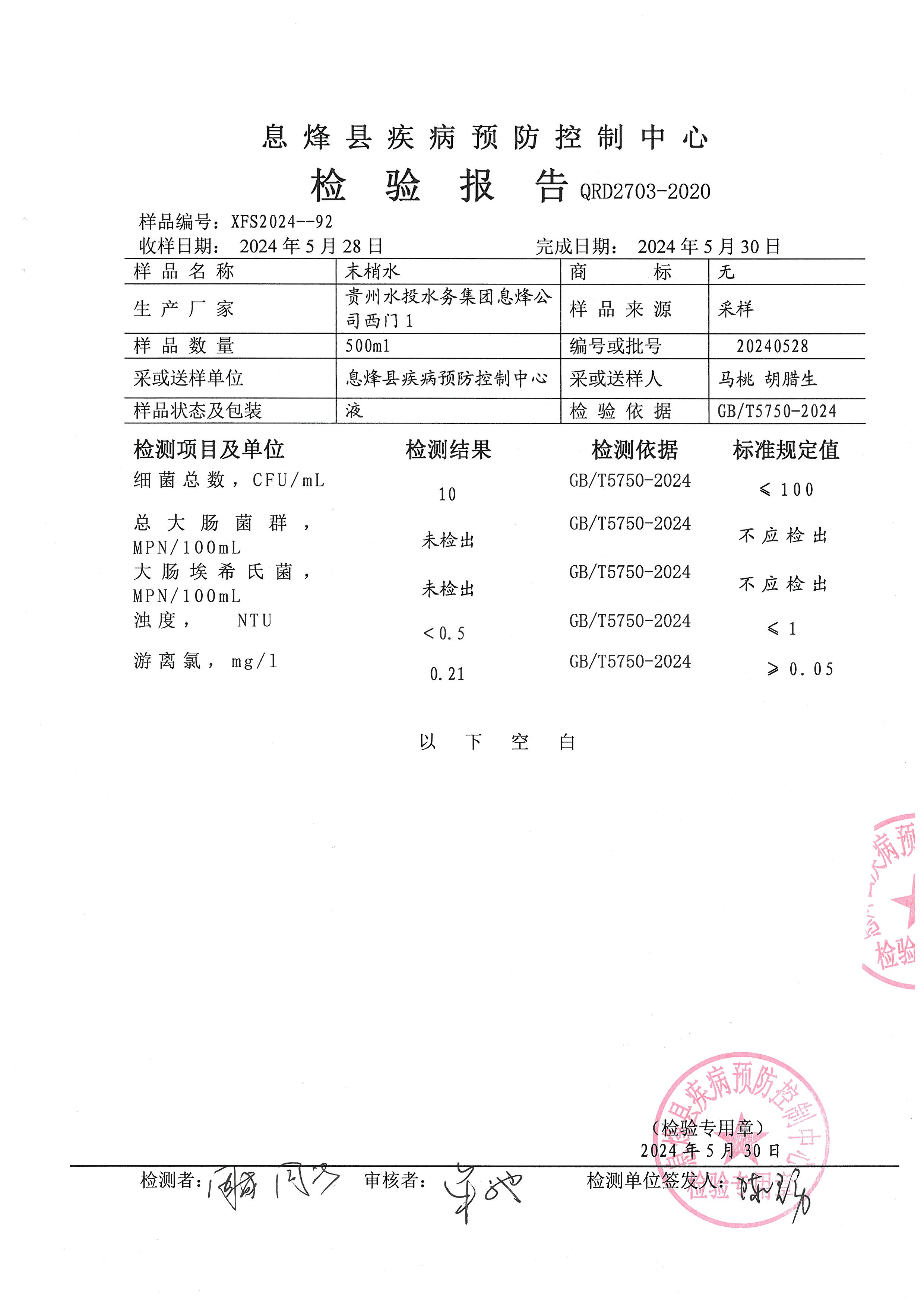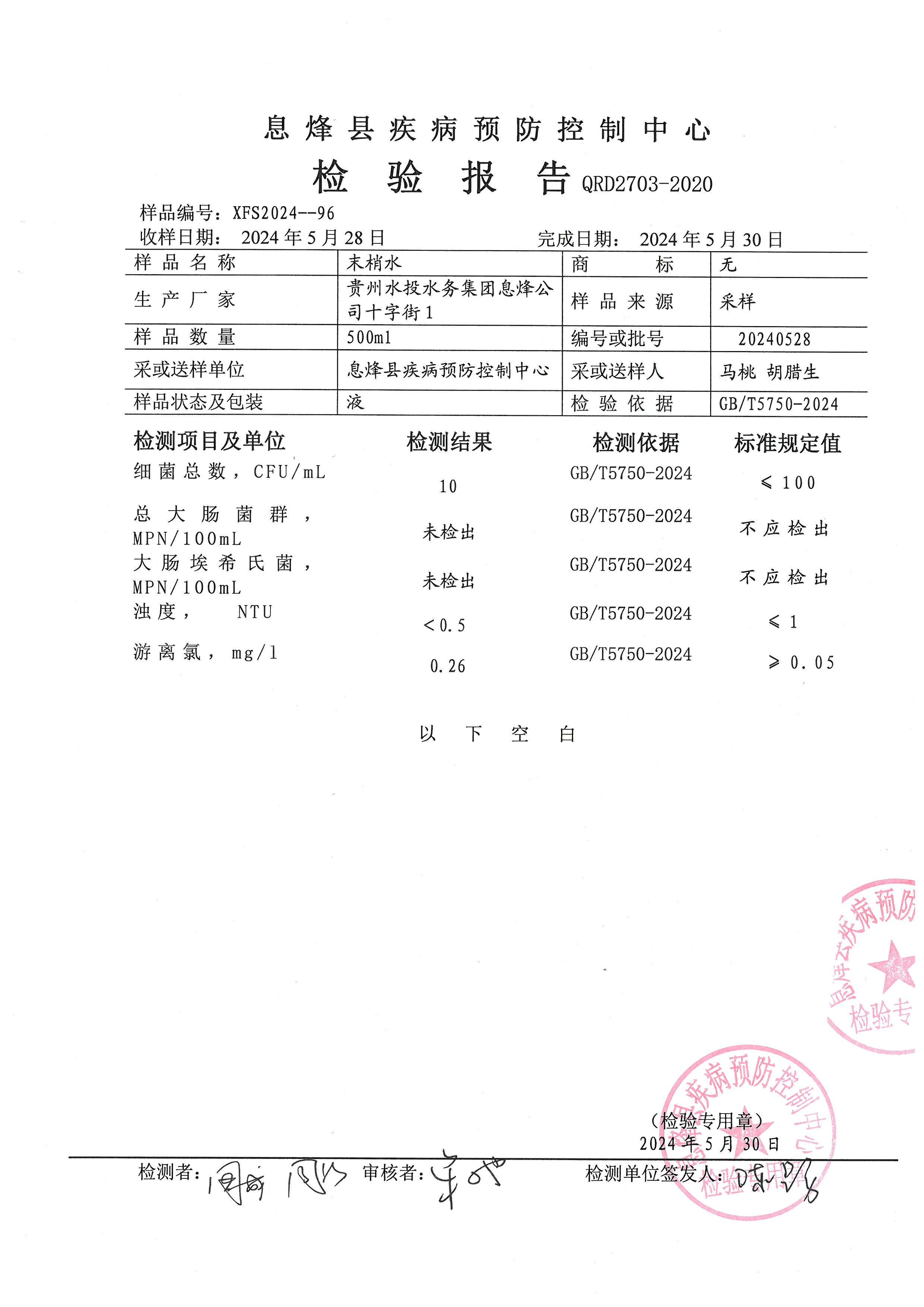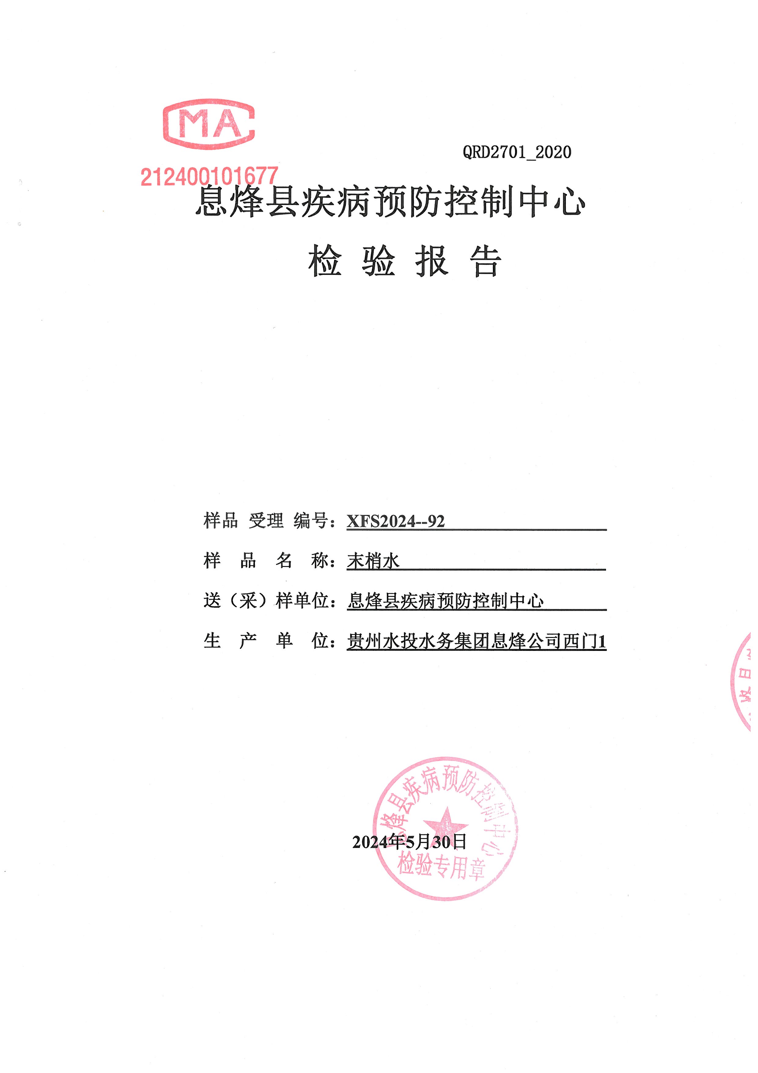 贵州水投水务集团息烽有限公司2024年5月水质检测报告