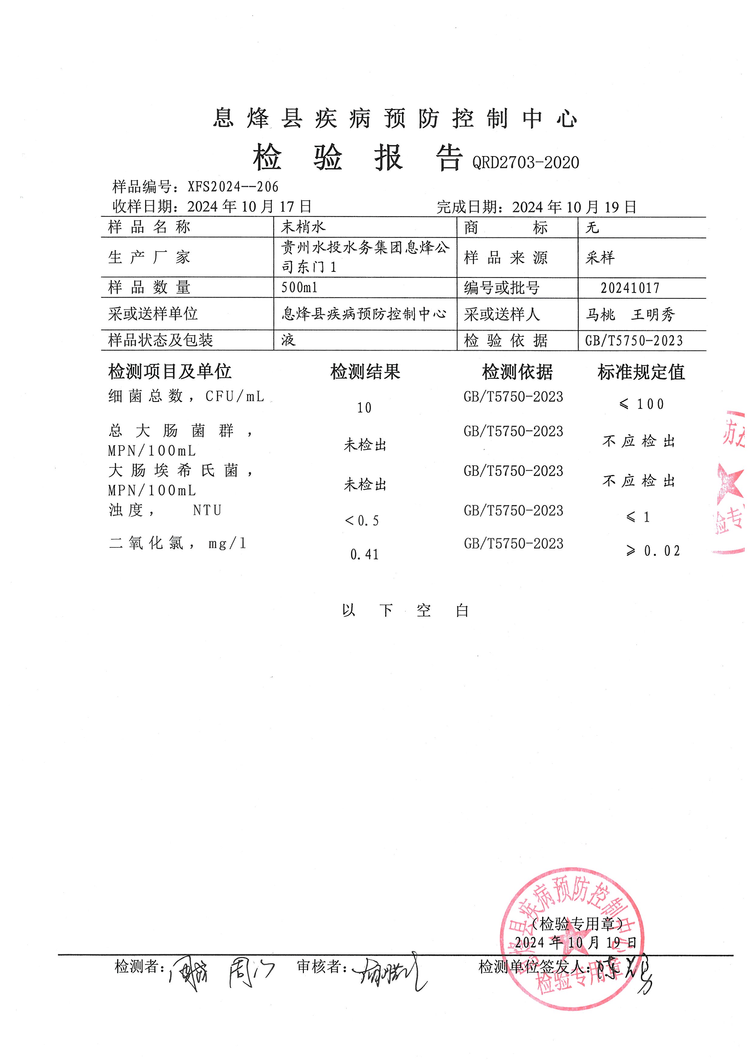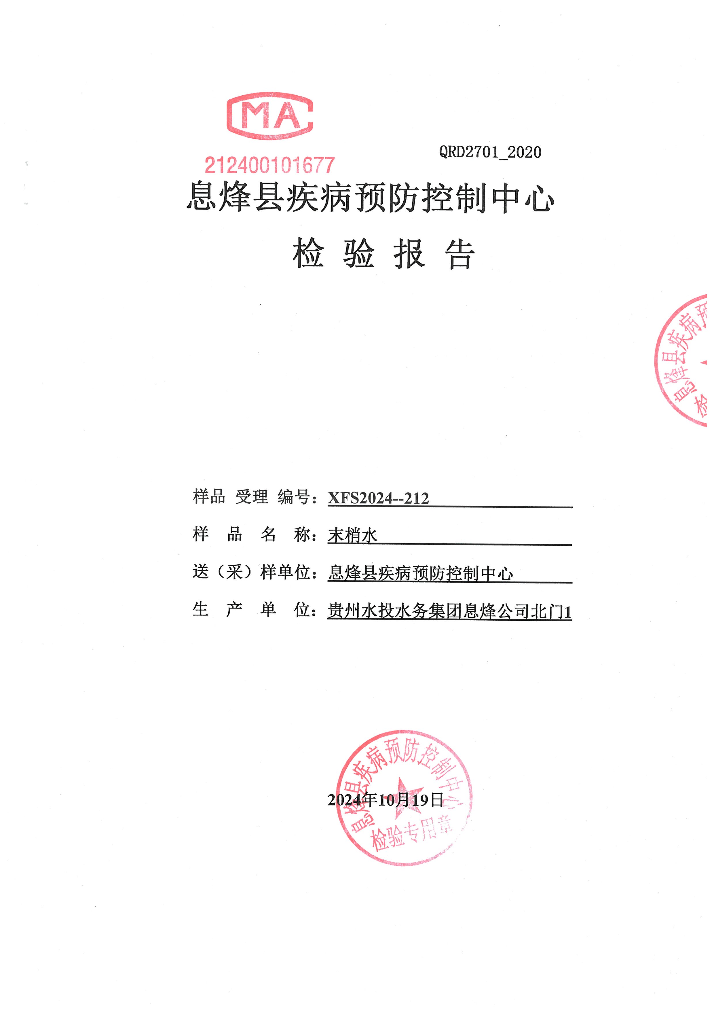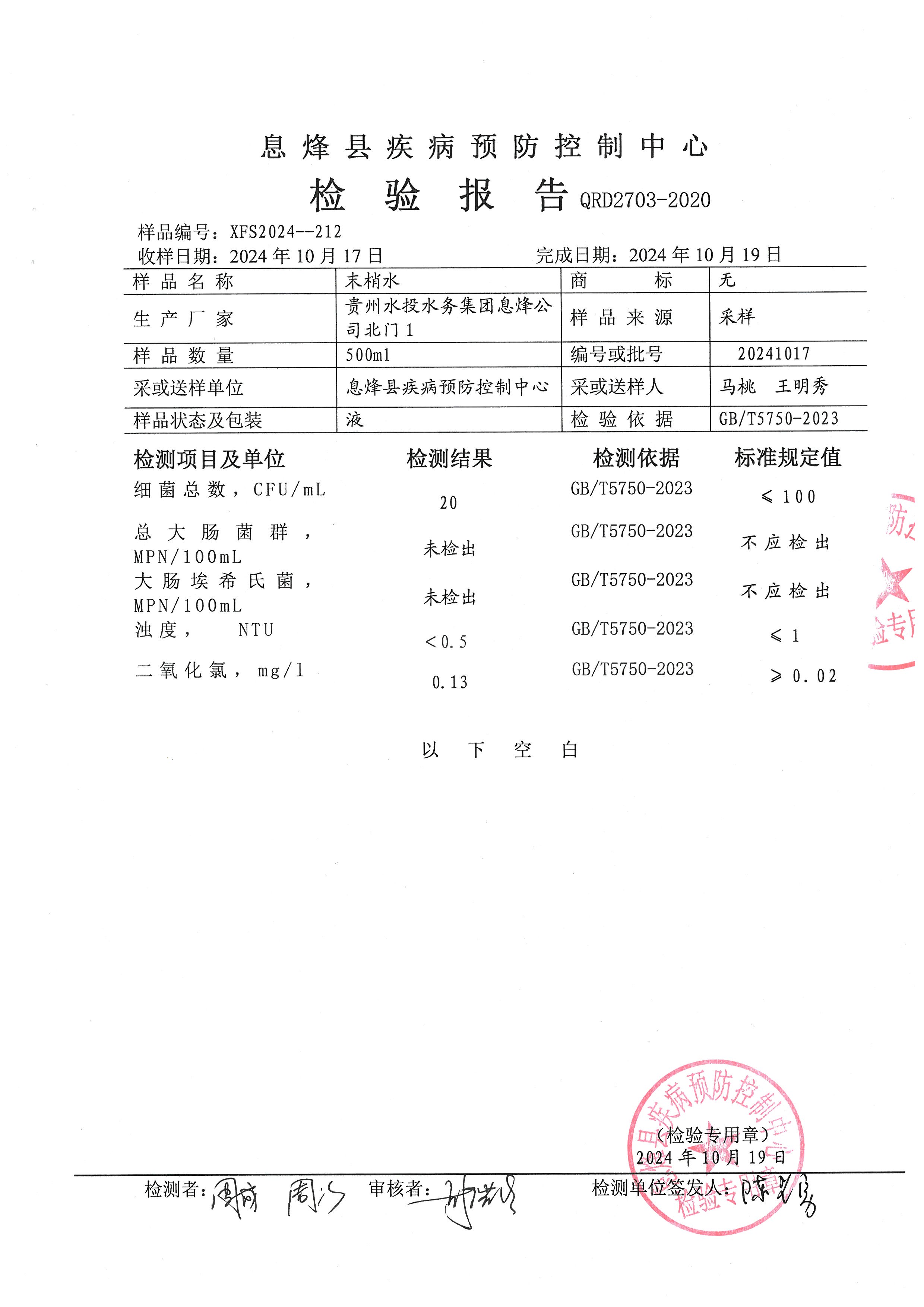 贵州水投水务集团息烽有限公司2024年10月水质检测报告