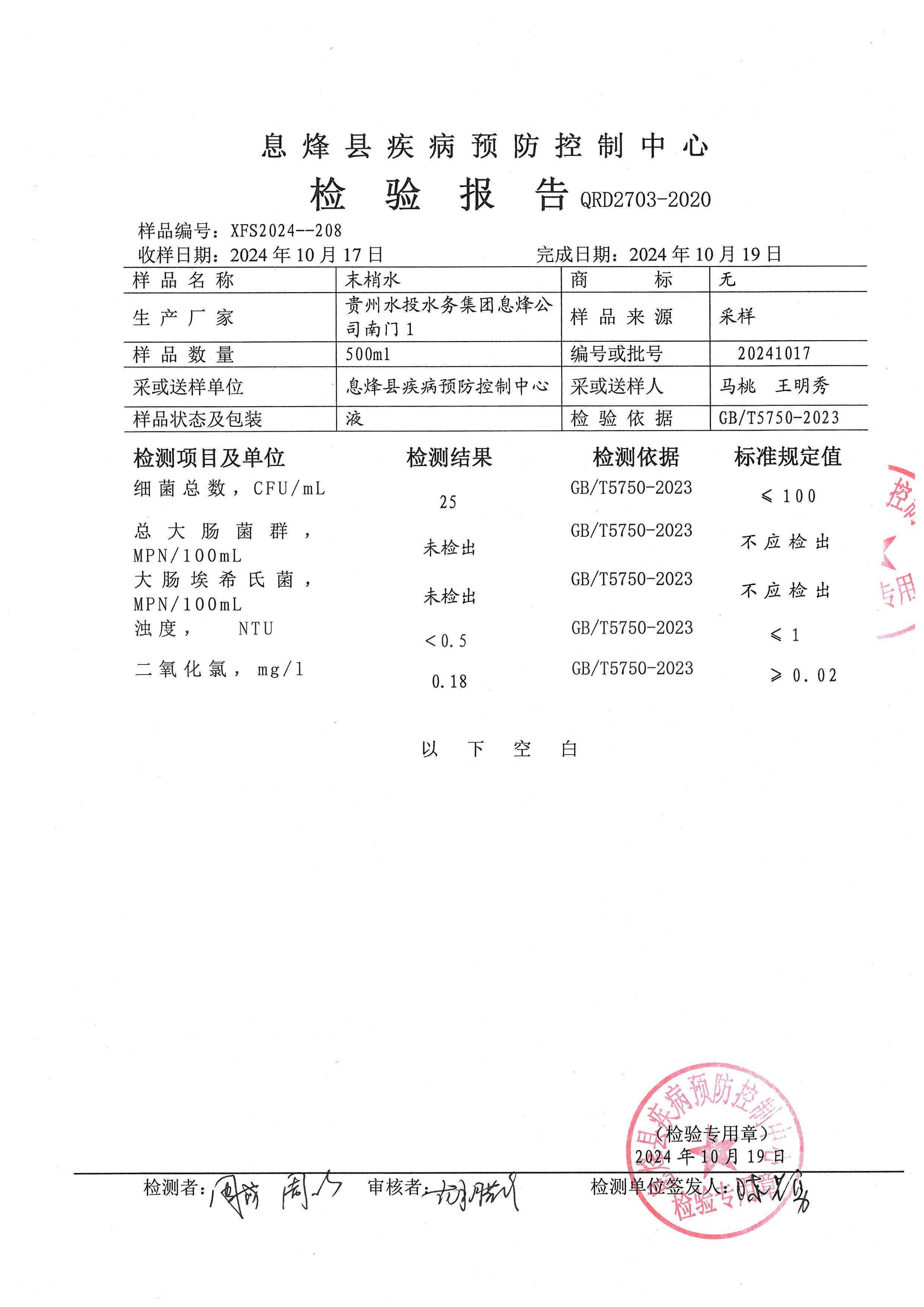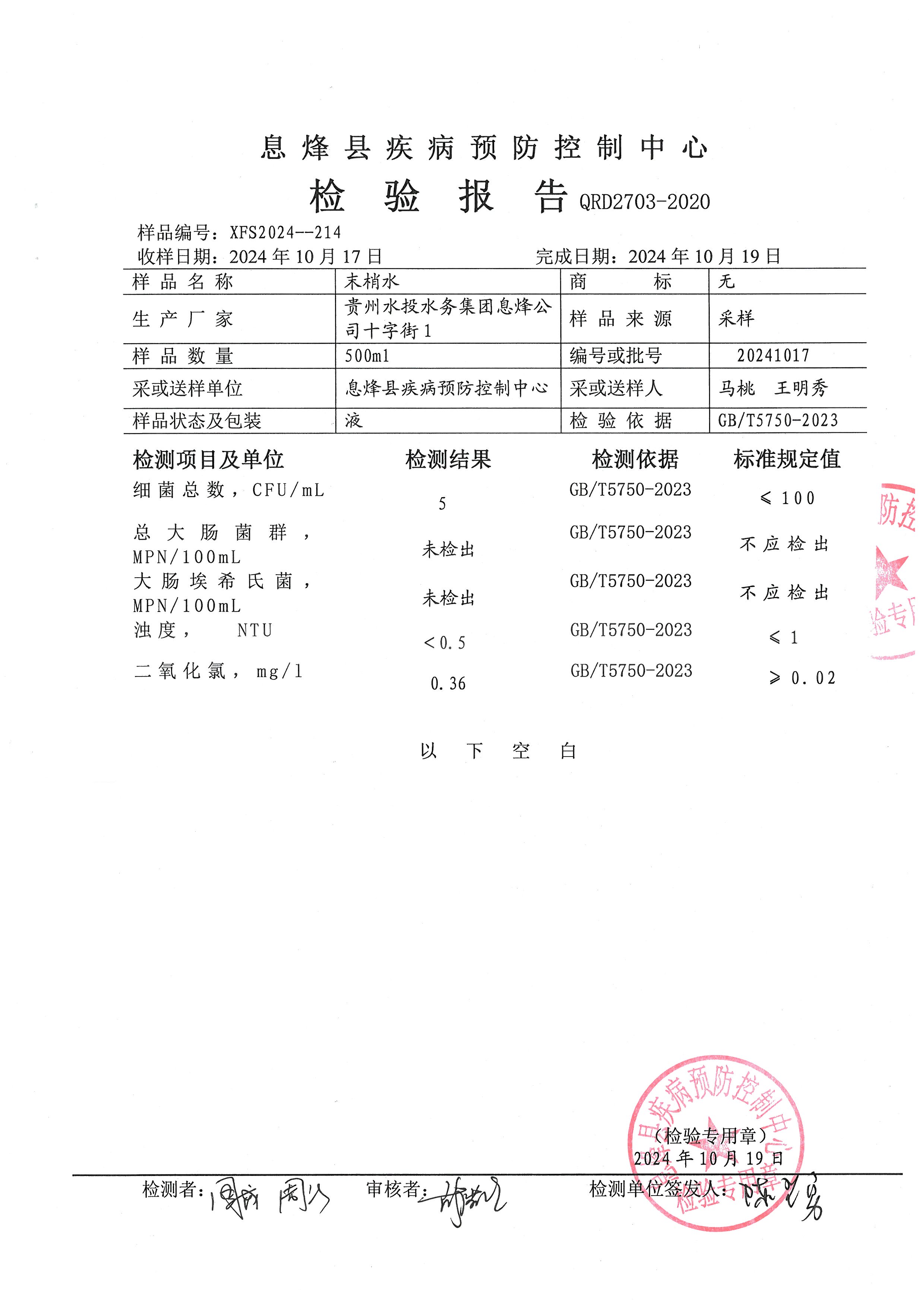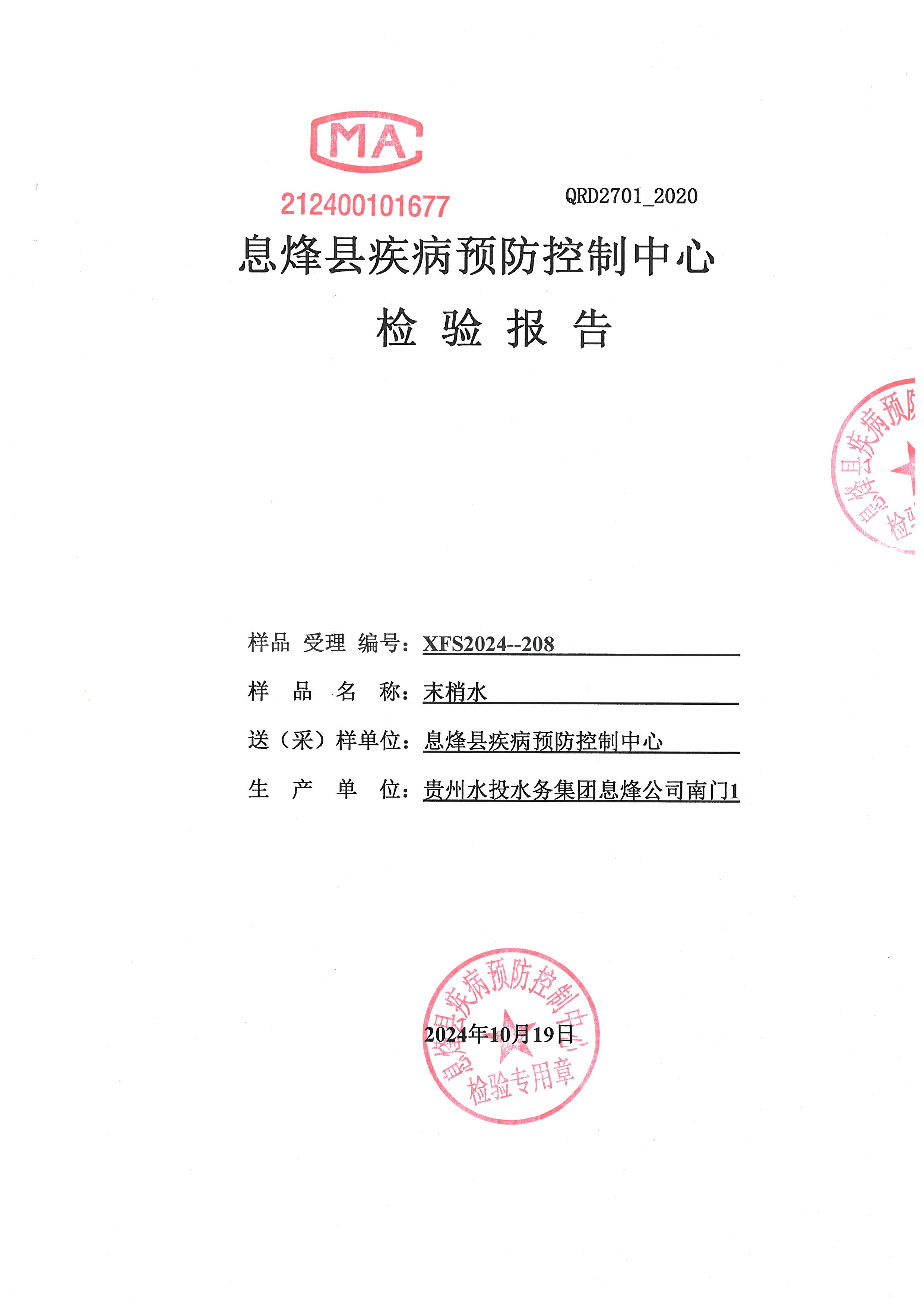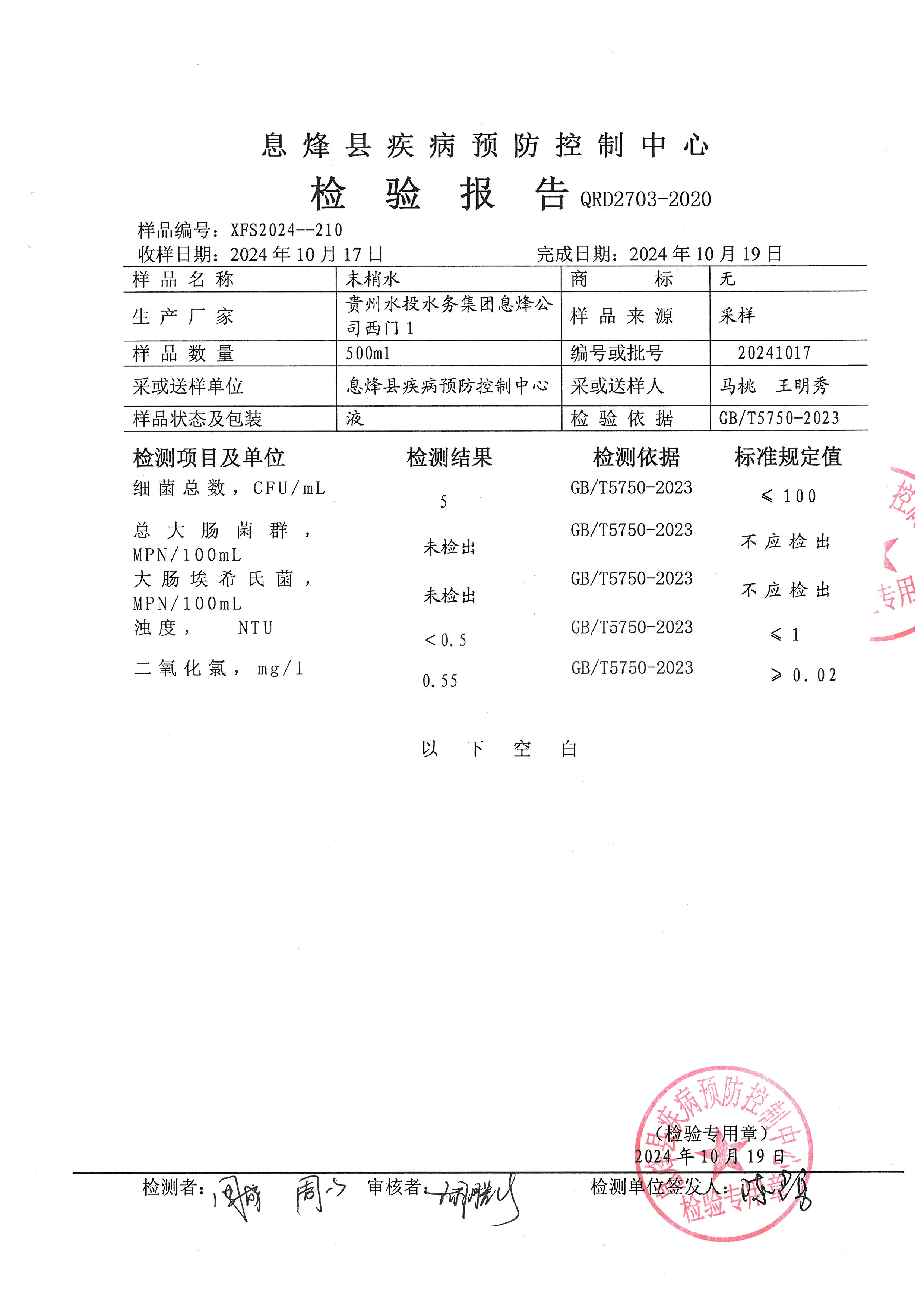 贵州水投水务集团息烽有限公司2024年10月水质检测报告