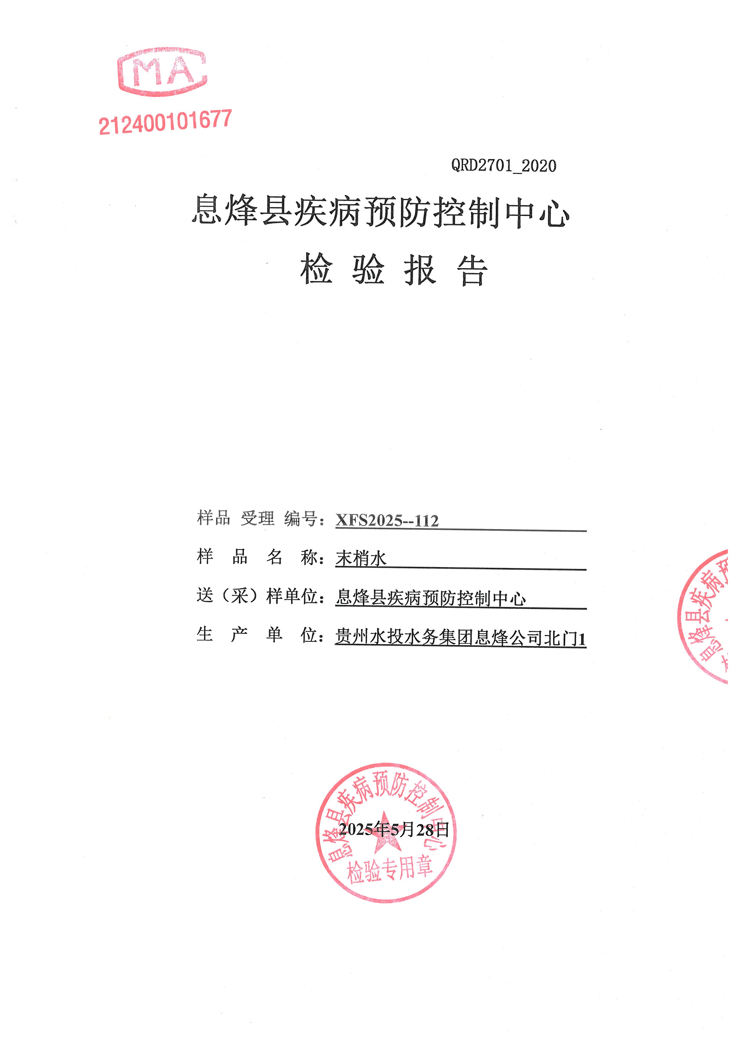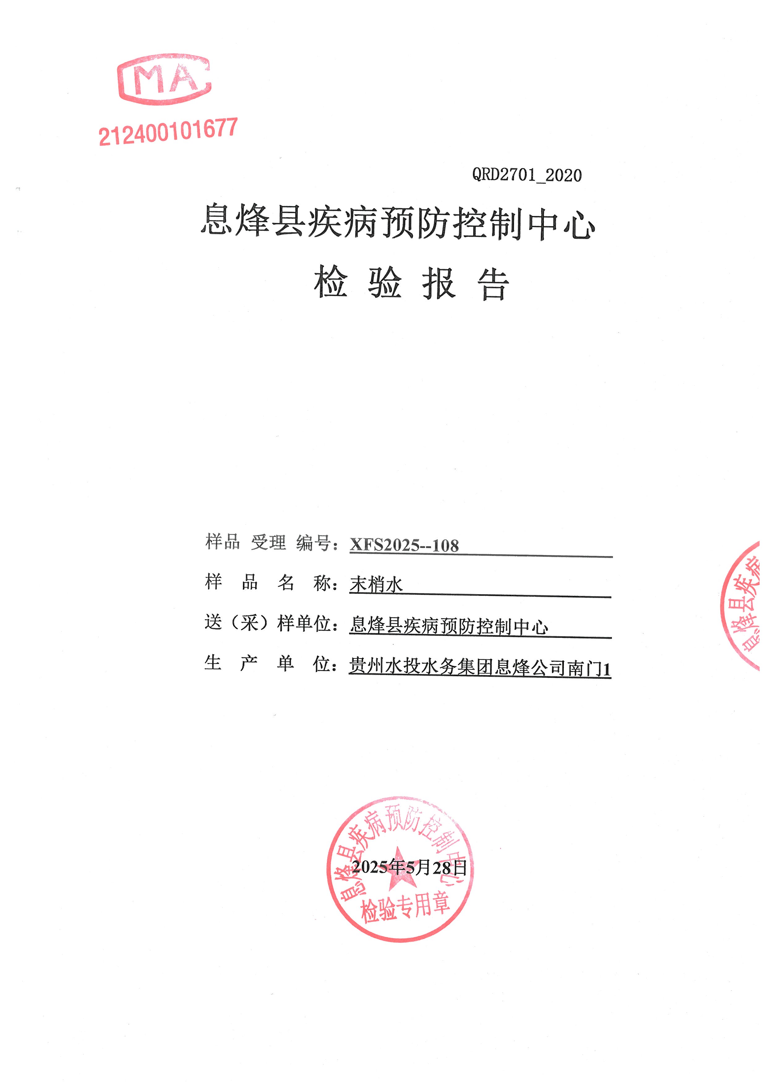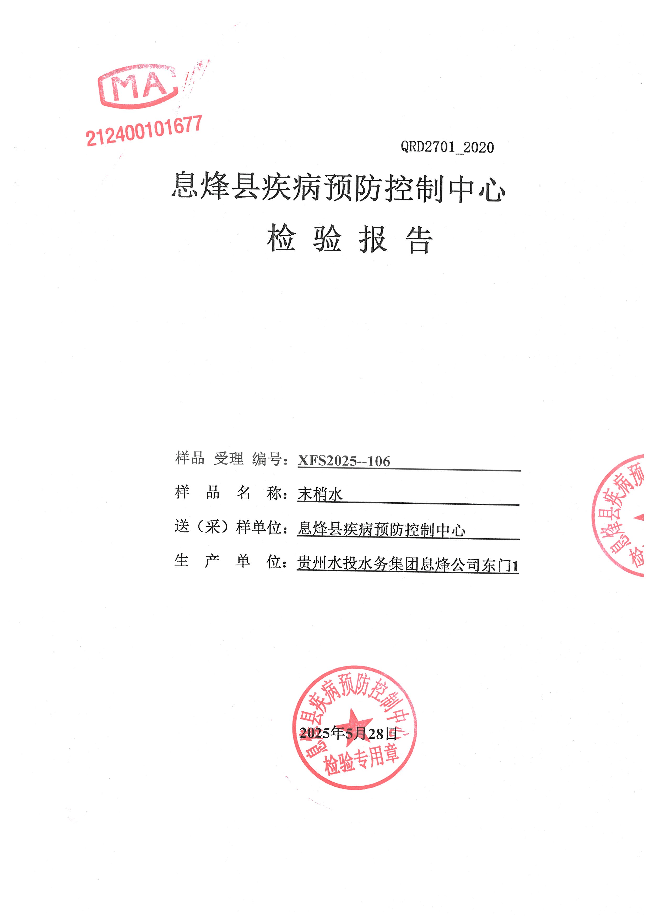 • 信息名称: 贵州水投水务集团息烽有限公司2025年5月份水质检验报告