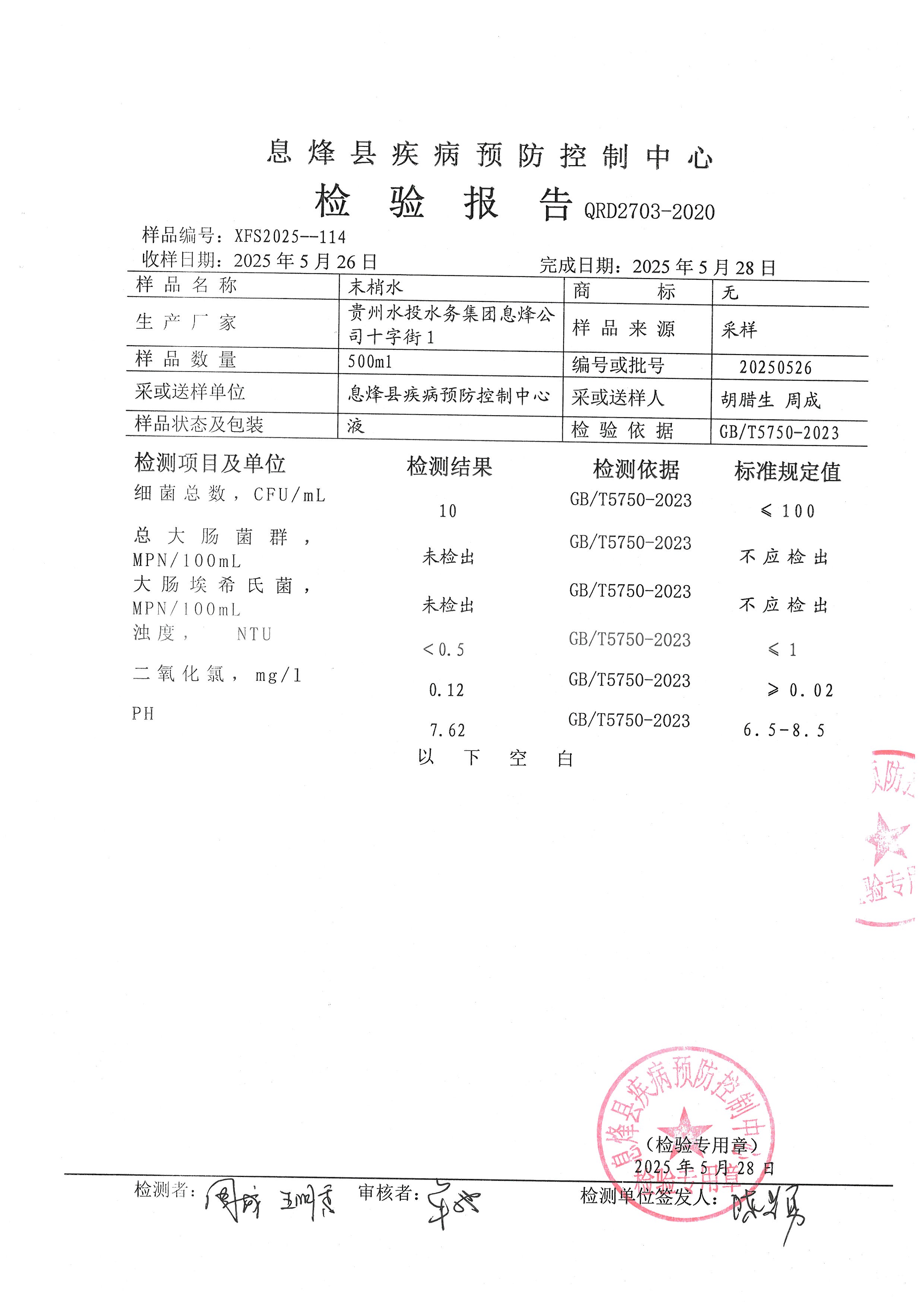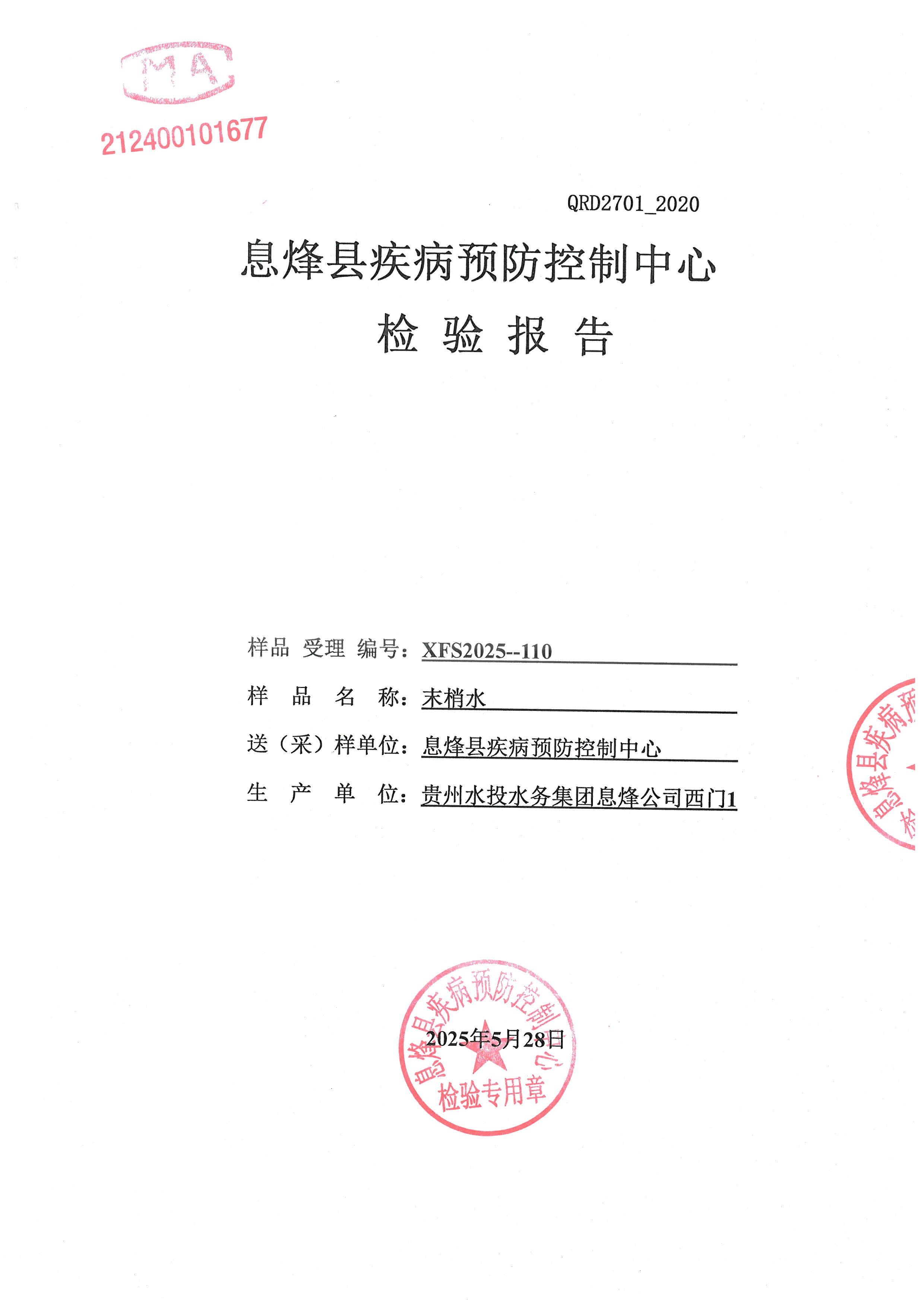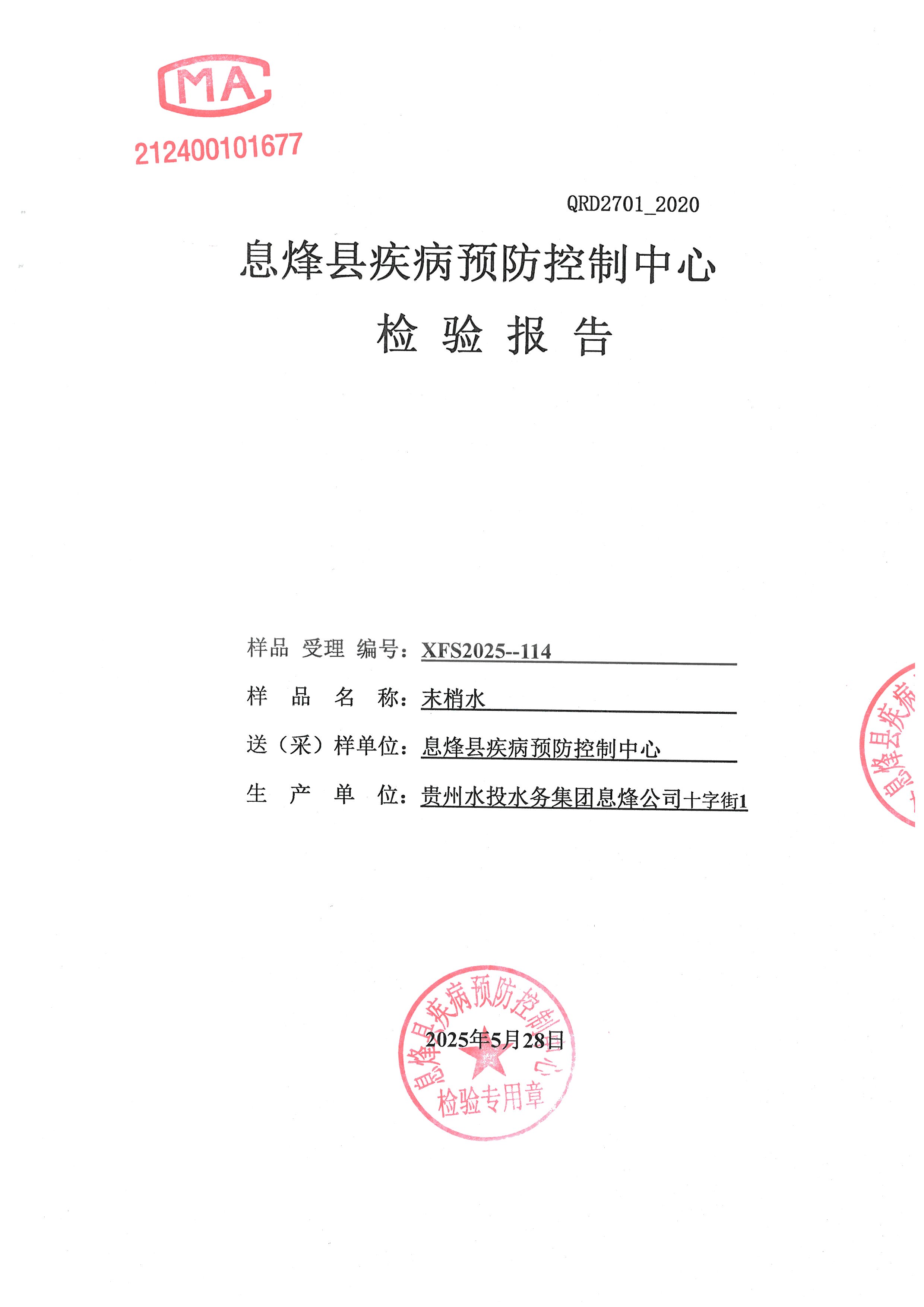 • 信息名称: 贵州水投水务集团息烽有限公司2025年5月份水质检验报告