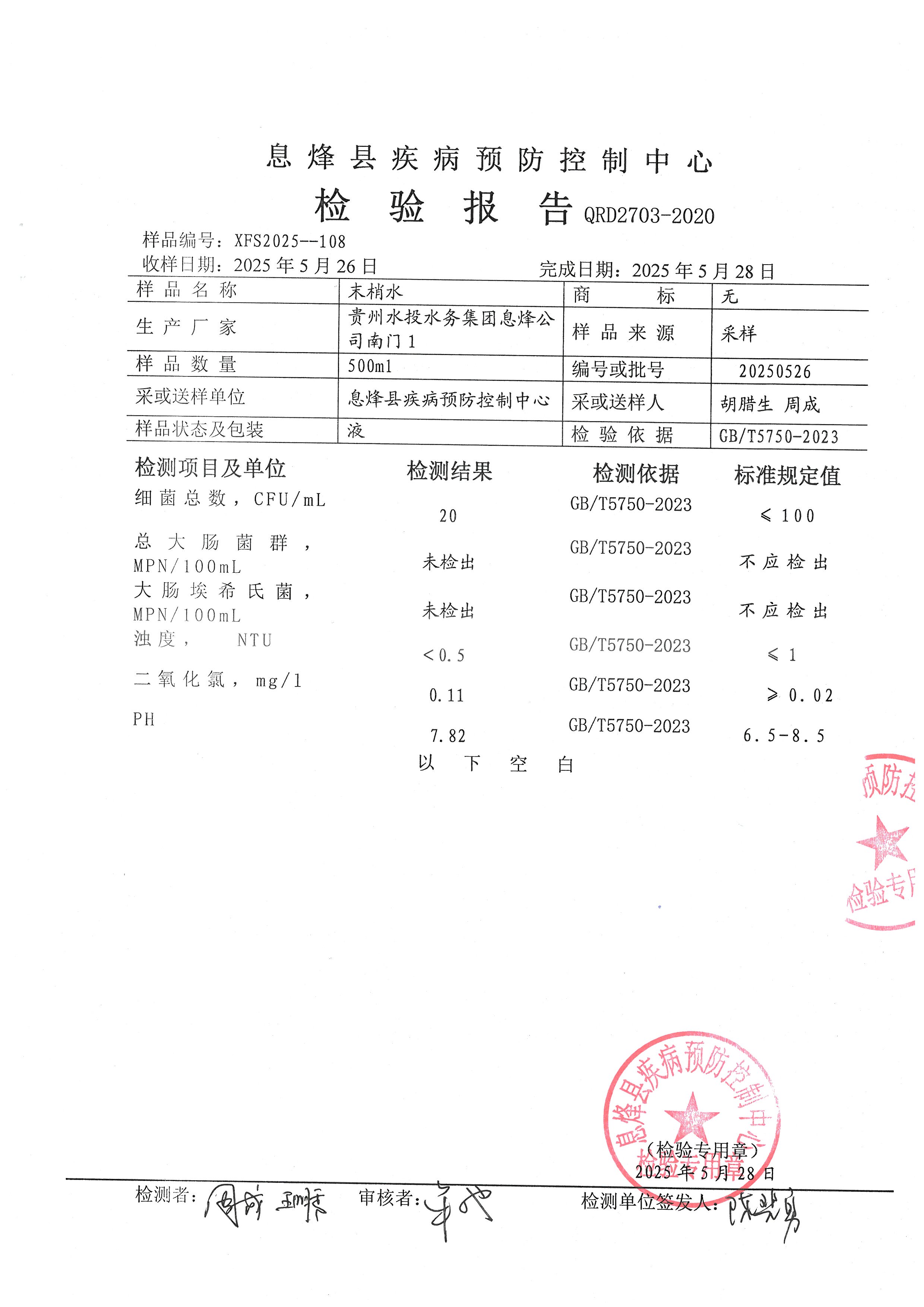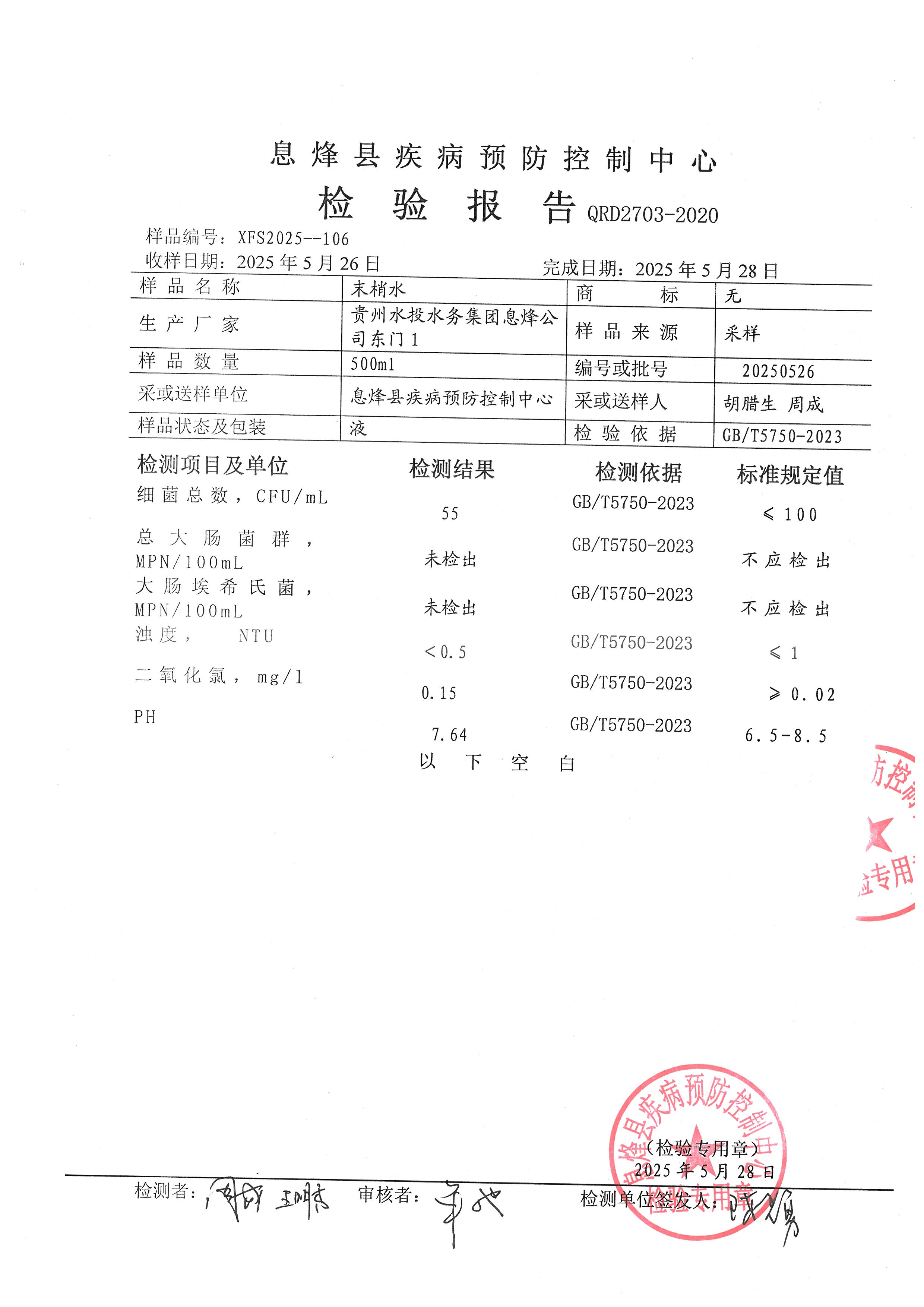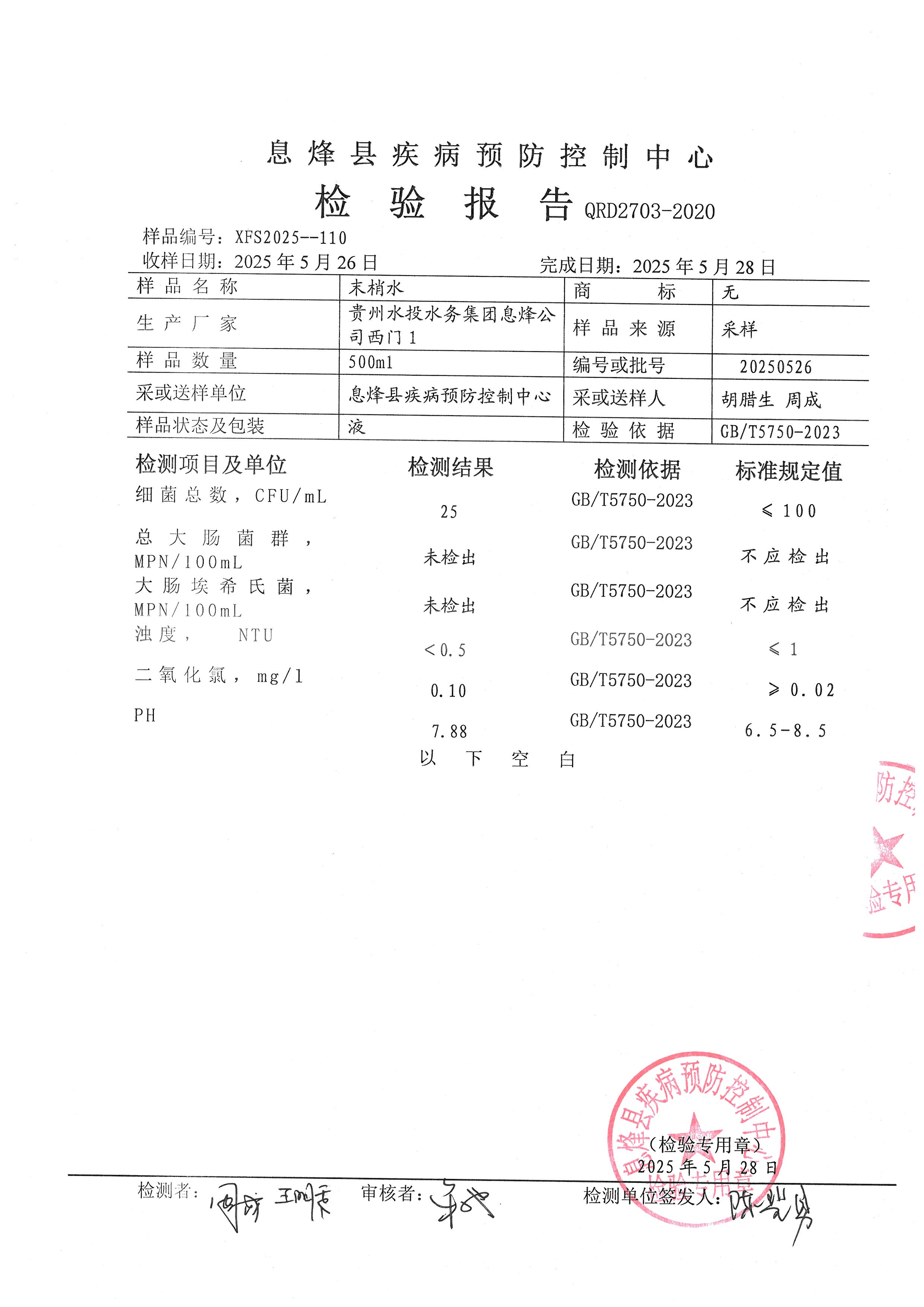 贵州水投水务集团息烽有限公司2025年5月份水质检验报告
