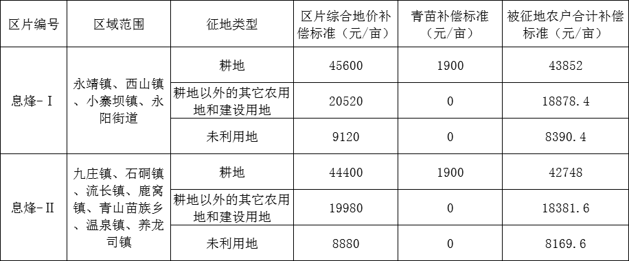 第二区片为温泉镇、九庄镇、石硐镇、流长镇、鹿窝镇、养龙司镇和青山苗族乡:耕地为44400元/亩的40%,即17760元/亩;耕地以外的其他农用地和建设用地为19980元/亩的40%,即7992元/亩;未利用地为8880元/亩。