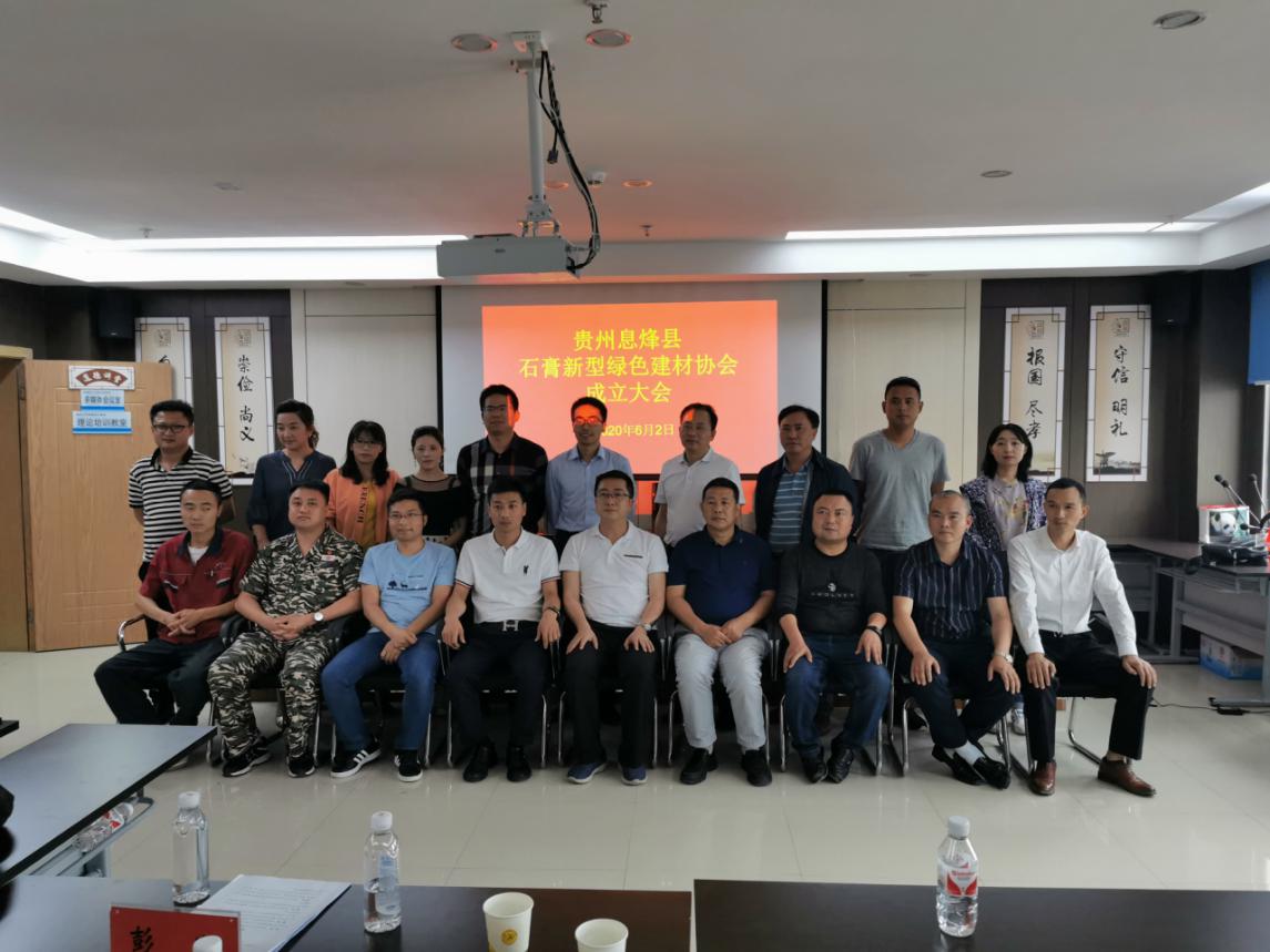 为2020年6月2日,贵州息烽县石膏新型绿色建材协会成立大会现场,选举成功,协会代表们合影留念。