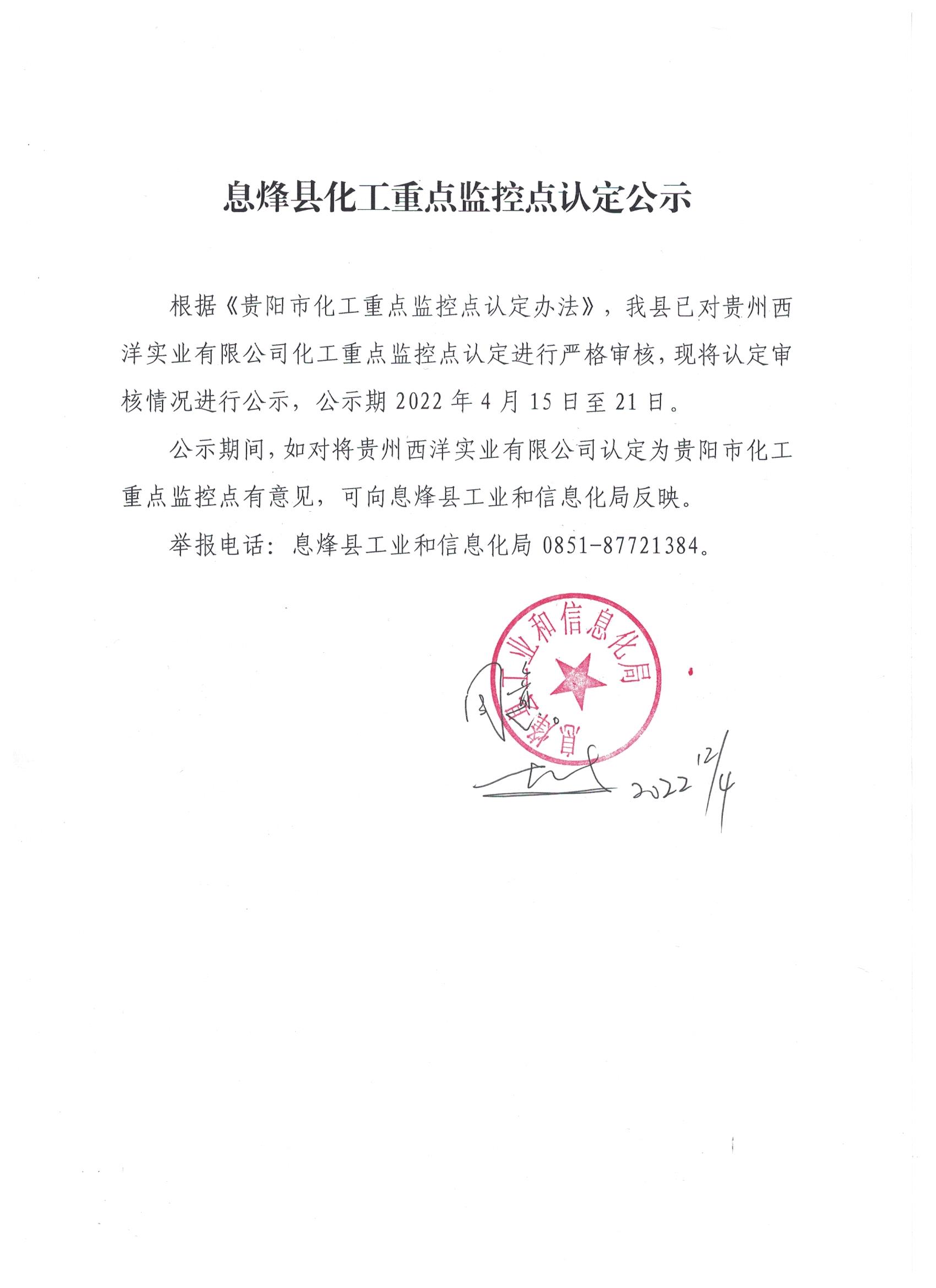 根据《贵阳市化工重点监控点认定办法》,我县已对贵州西洋实业有限公司化工重点监控点认定进行严格审核,现将认定审核情况进行公示,公示期2022年4月15日至21日。