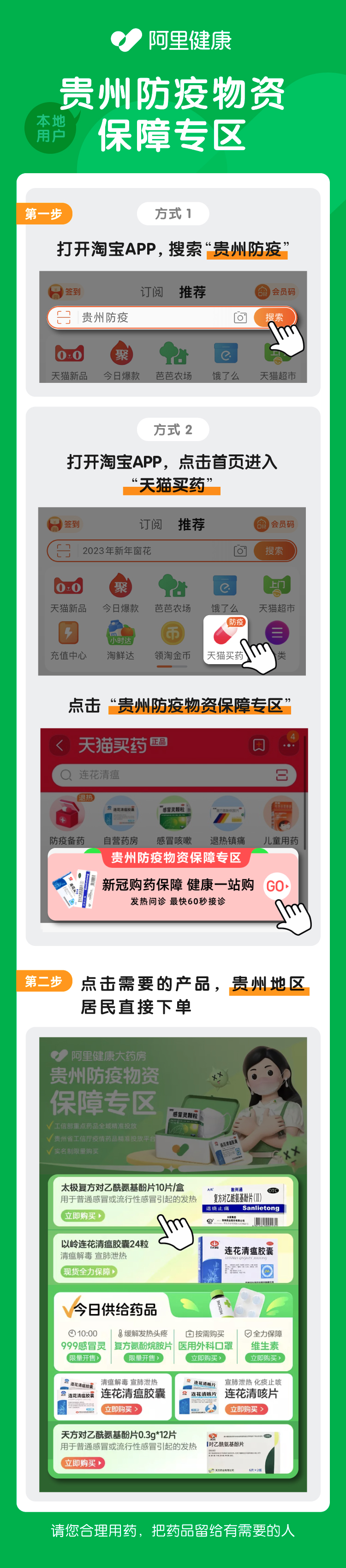 1月4日,贵州省工信厅联合阿里健康,向工信部争取调度了连花清瘟等紧急药品和抗疫物资,通过阿里健康专属通道,在贵州地区进行重点药品精准投放,后期还将根据实际情况持续加大物资投入。贵州居民只需打开淘宝App搜索“贵州防疫”,或进入“天猫买药”,即可直达“贵州防疫物资保障专区”,按需购买。首期上线连花清瘟20万盒,散列通2万盒,后续还将陆续上线抗原、N95口罩、止咳药品等。