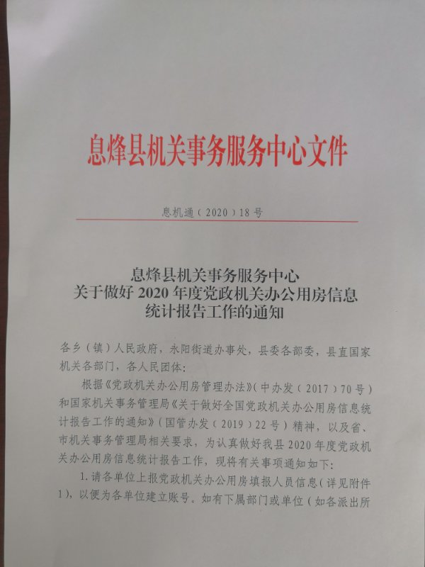 • 信息名称: 息烽县机关事务服务中心关于做好2020年度党政机关办公用房信息统计报告工作的通知