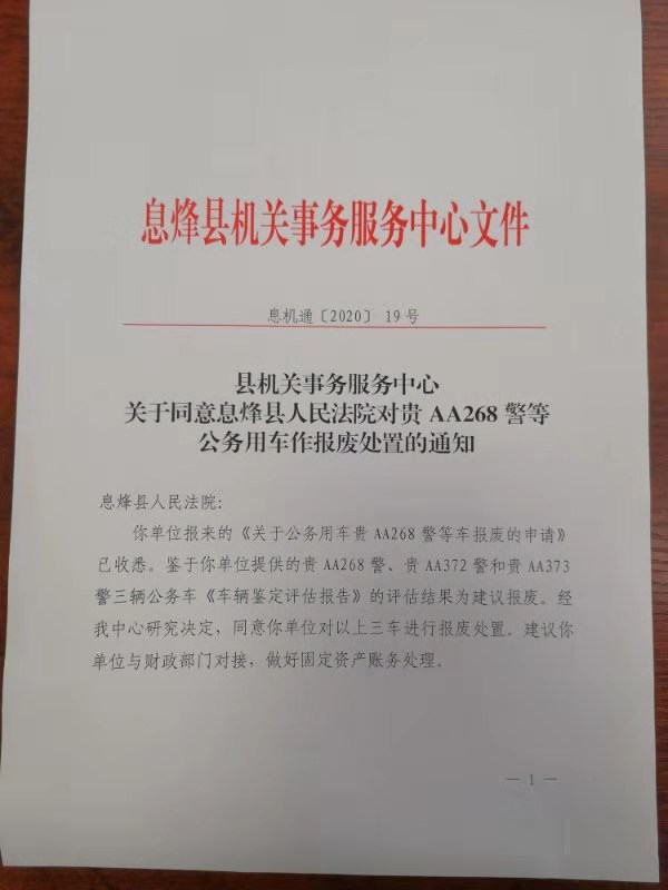 • 信息名称: 县机关事务服务中心关于同意息烽县人民法院对贵AA268警等公务用车作报废处置的通知