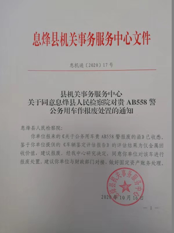• 信息名称: 县机关事务服务中心关于同意息烽县人民检察院对贵AB558警公务用车作报废处置的通知