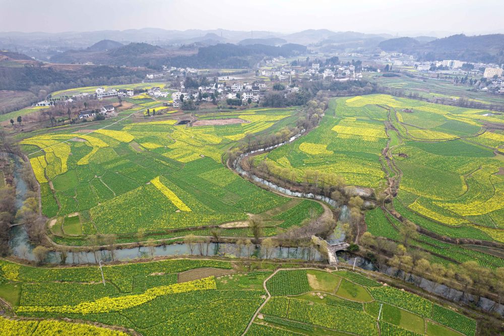 贵州省黔西市洪水镇解放村油菜花次第开放。(史开心 摄)