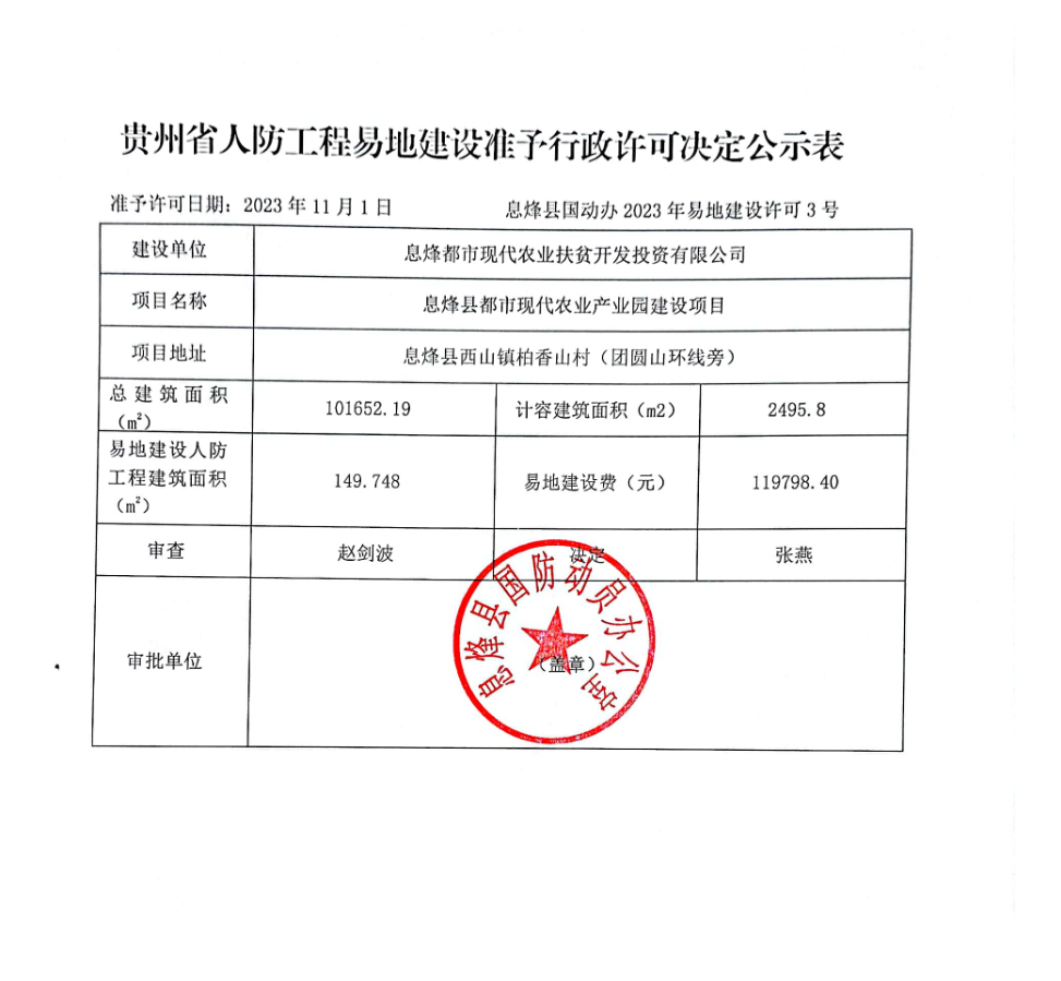 息烽县人防工程易地建设准予行政许可决定公示表(息烽县国动办2023年易地建设许可3号)