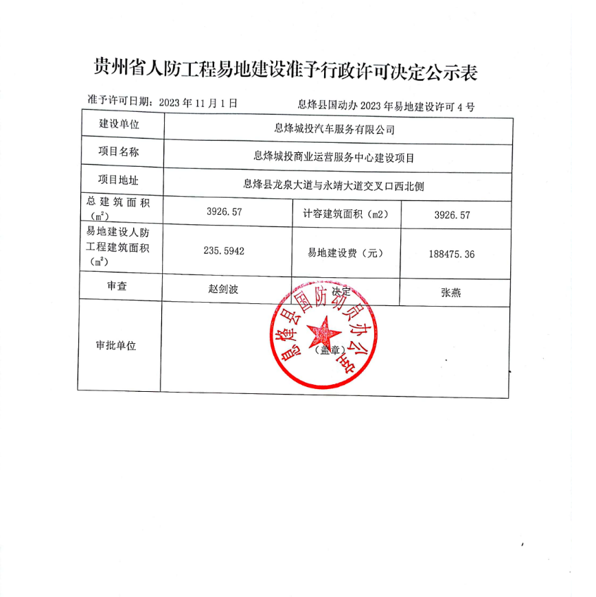 息烽县人防工程易地建设准予行政许可决定公示表(息烽县国动办2023年易地建设许可4号)