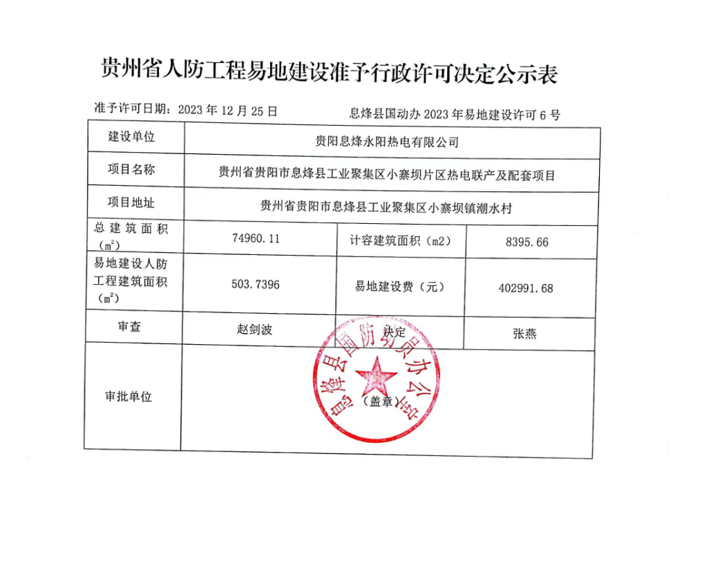 息烽县人防工程易地建设准予行政许可决定公示表(息烽县国动办2023年易地建设许可6号)