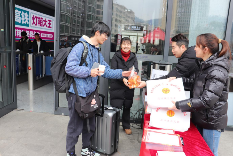 随着春运大幕的开启,息烽县总工会联合息烽县人力资源和社会保障局、永阳街道、团县委等多家部门在息烽县高铁站出站口设置了返乡农民工服务点,为返乡农民工提供热气腾腾的姜茶、面包和春联等暖心物资。服务点现场还设立政策咨询台,积极宣传本地的就业岗位信息、创业扶持政策以及劳动法律法规,帮助群众更好地了解就业、劳动权益保障等相关政策。