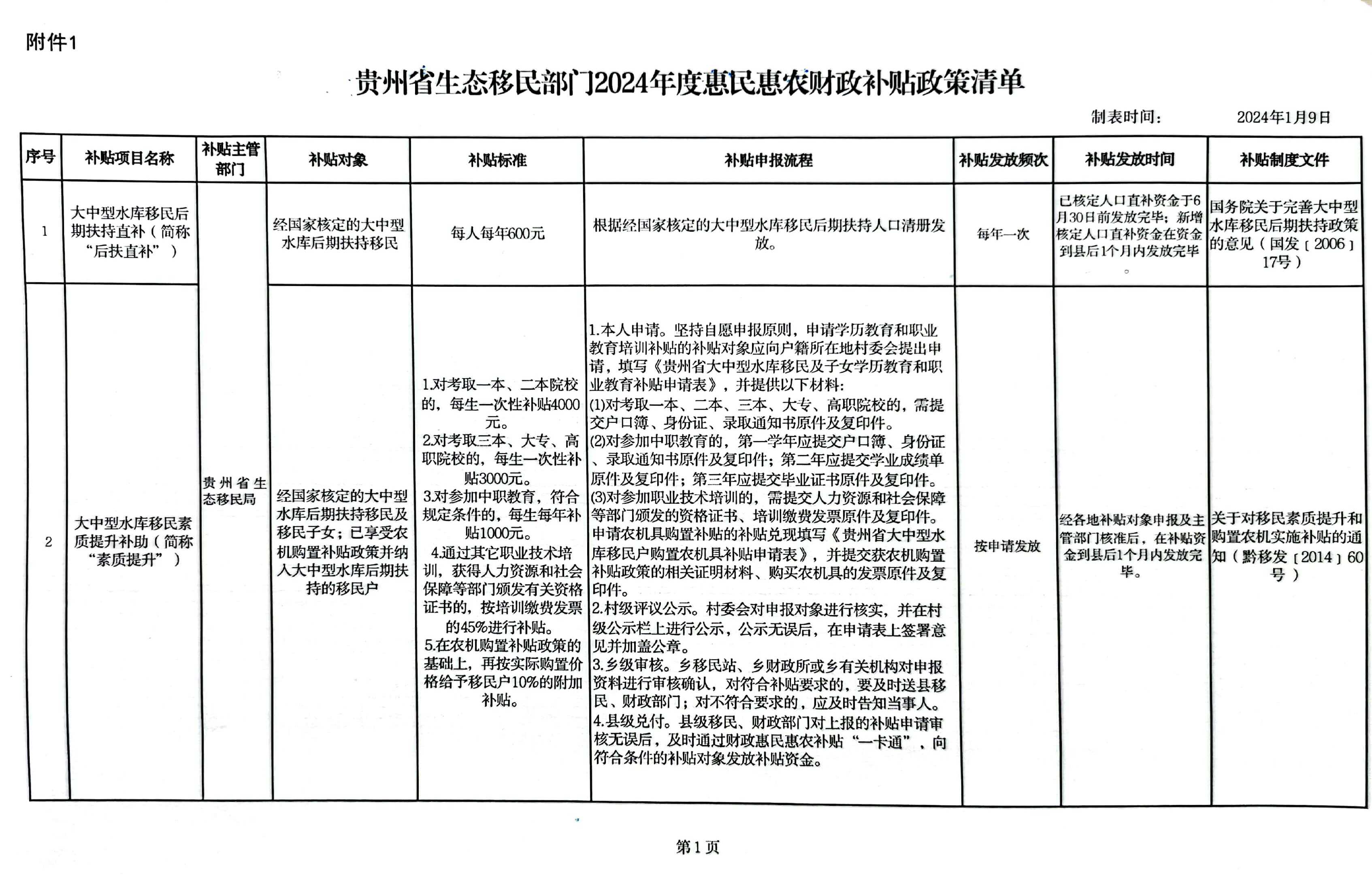 贵州省生态移民部门2024年度惠民惠农财政补贴政策清单