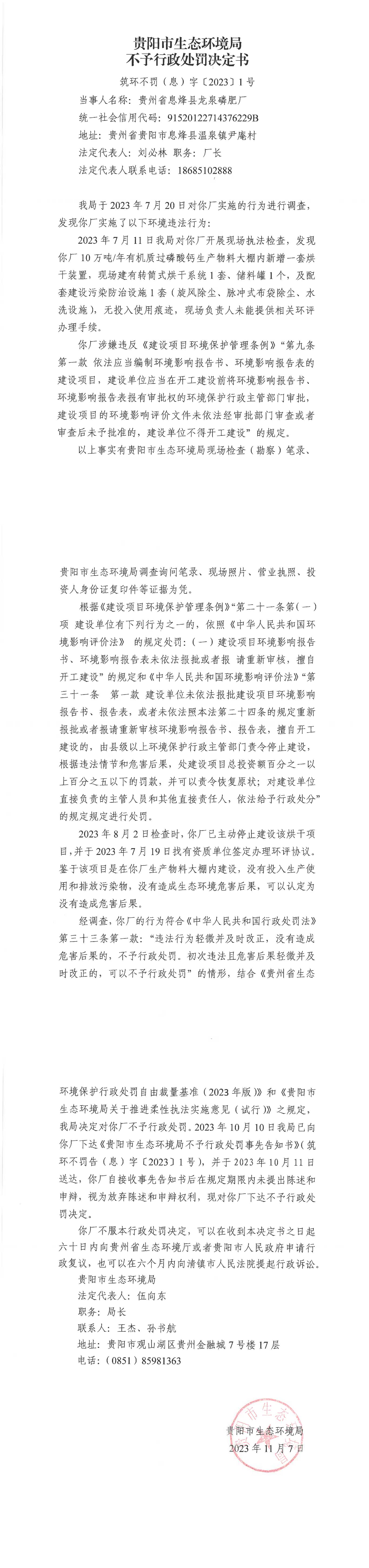 筑环不罚(息)字〔2023〕1号 贵州省息烽县龙泉磷肥厂不予行政处罚决定书