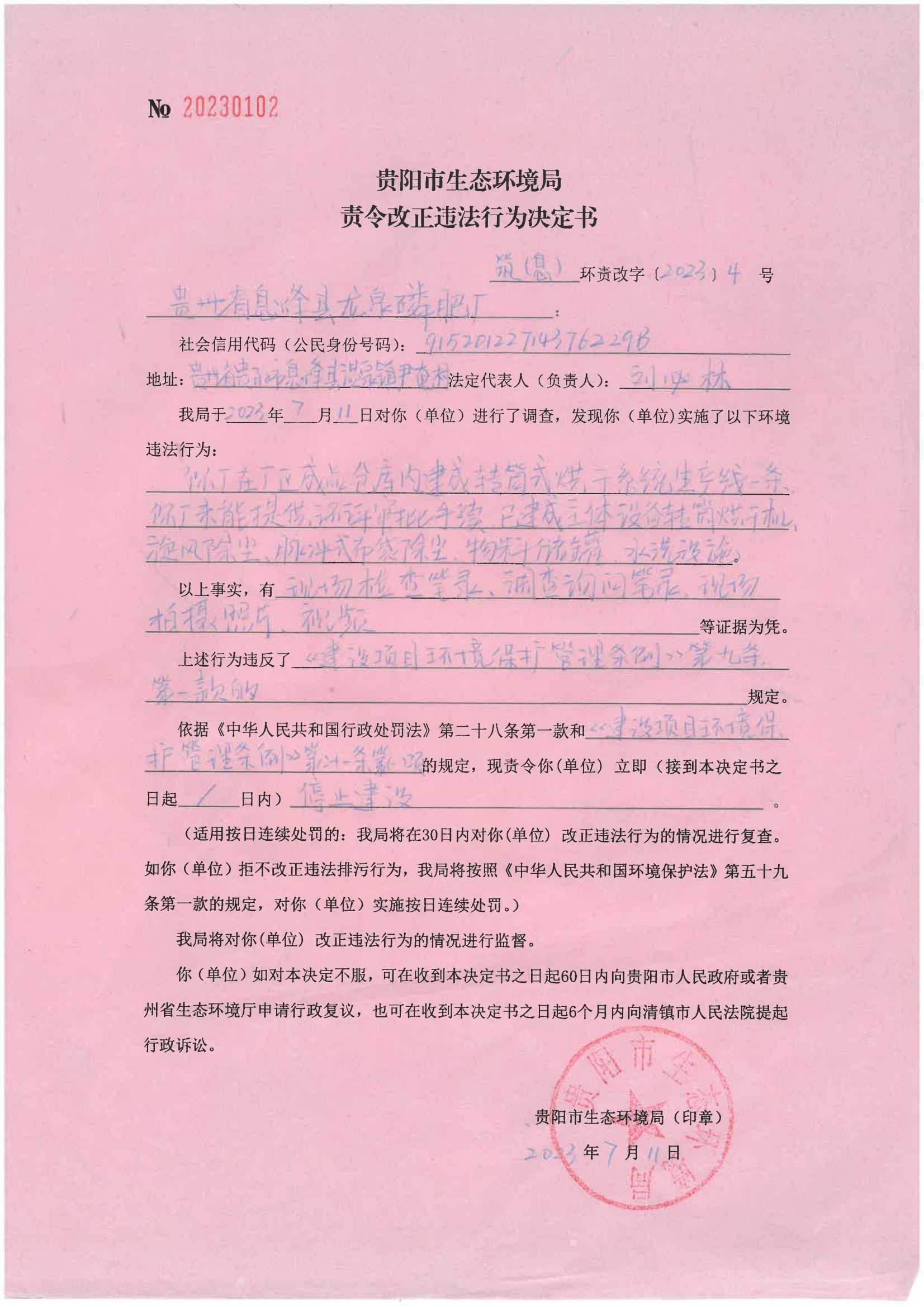 • 信息名称: 筑(息)环责改〔2023〕4号 贵州省息烽县龙泉磷肥厂责令改正违法行为决定书