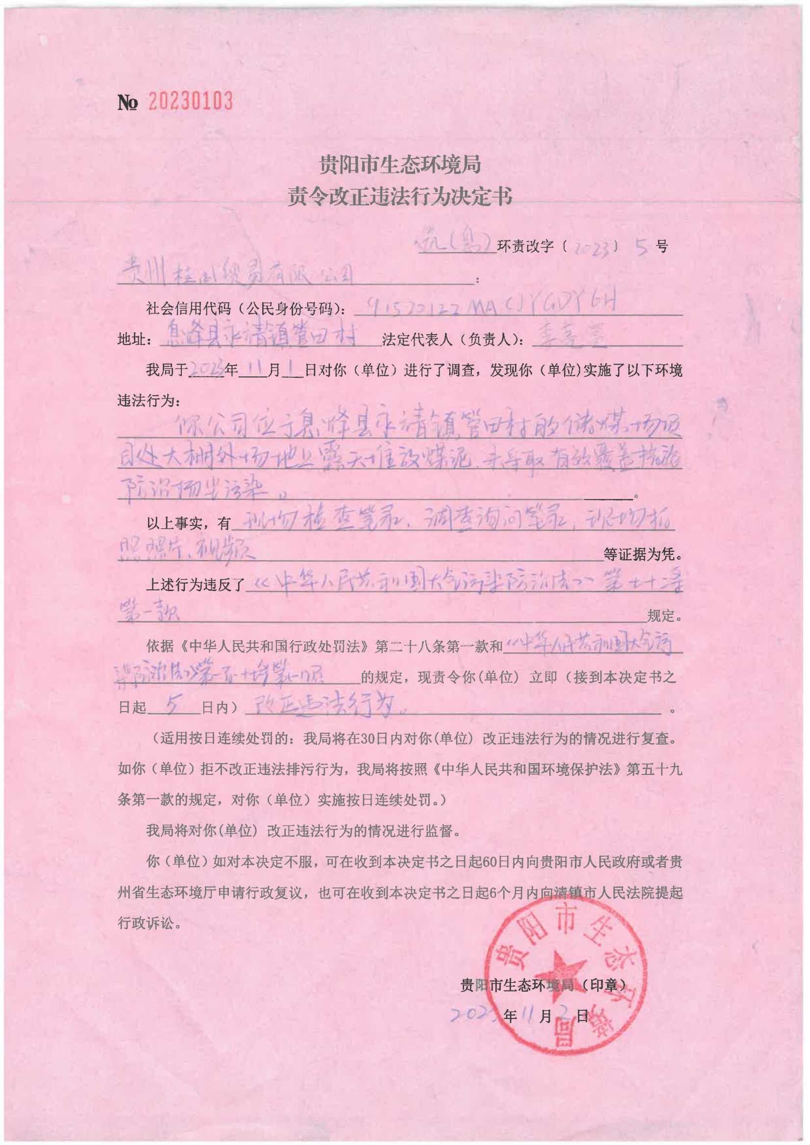 筑(息)环责改字〔2023〕5号 贵州桂闽贸易有限公司责令改正违法行为决定书