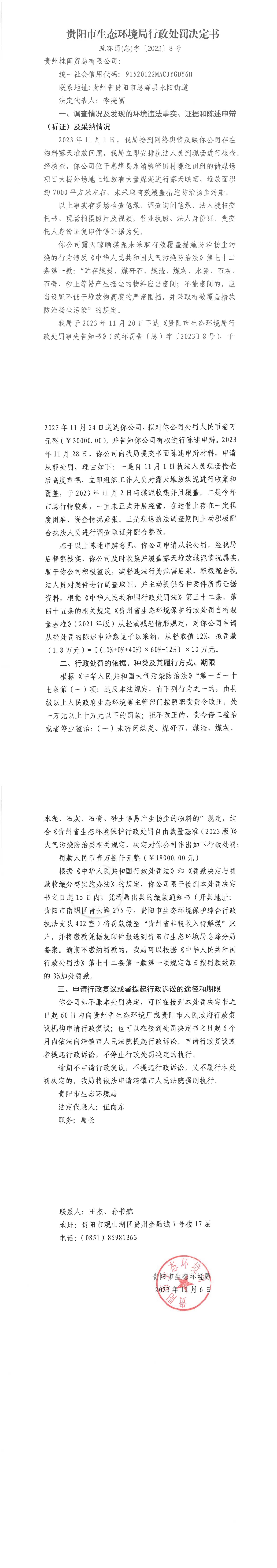 • 信息名称: 筑环罚(息)字〔2023〕8号 贵州桂闽贸易有限公司行政处罚决定书