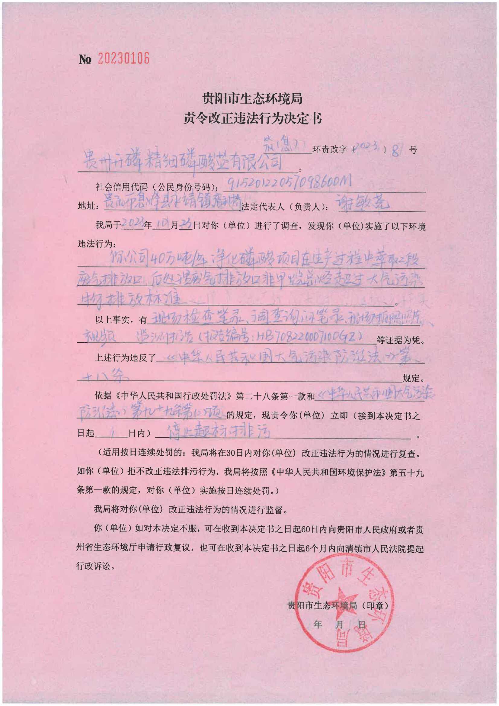 • 信息名称: 筑(息)环责改字〔2023〕8号 贵州开磷精细磷酸盐有限公司责令改正违法行为决定书